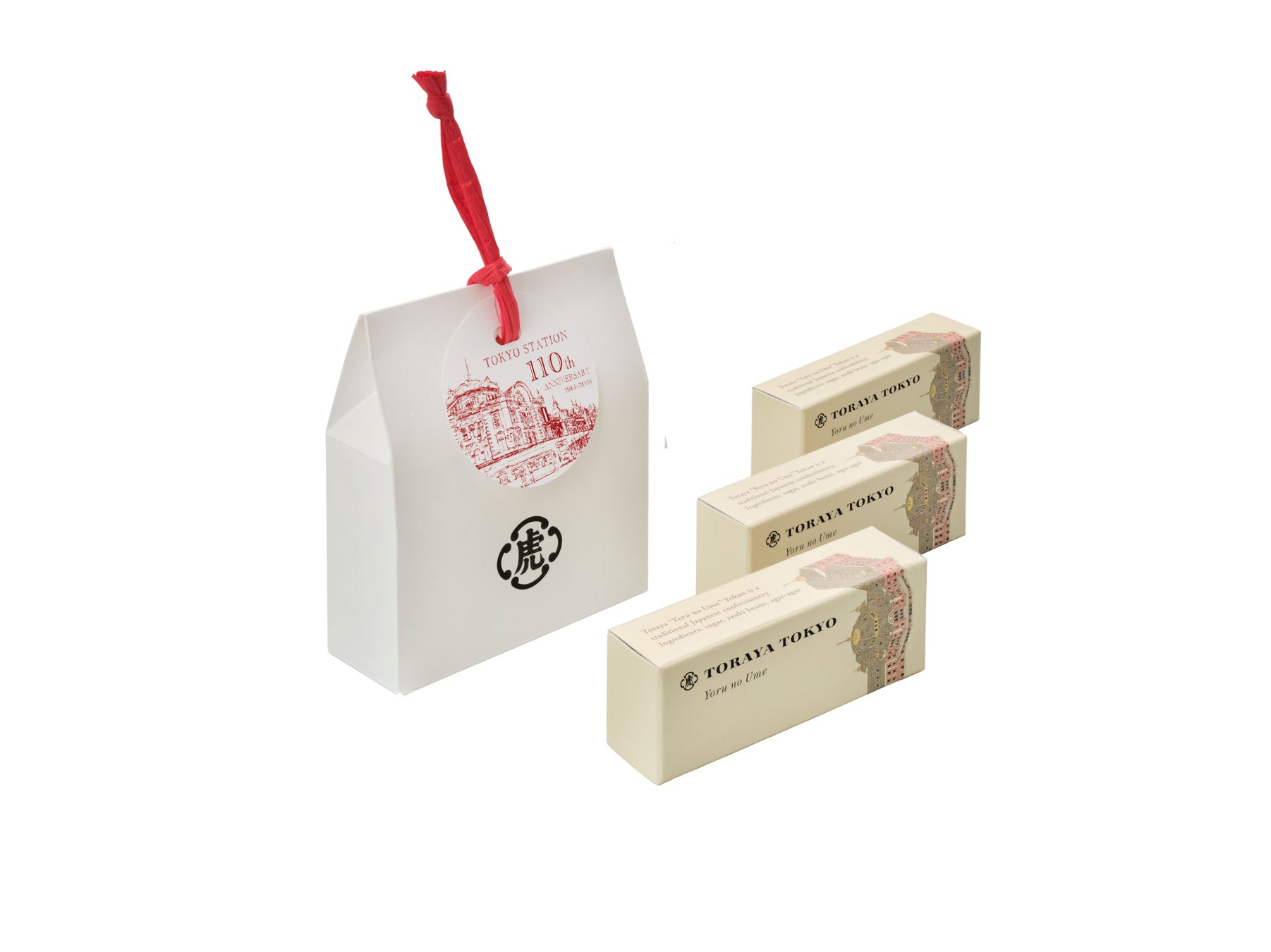 パリ在住の画家、P.ワイズベッカー氏が描いた東京駅丸の内駅舎をパッケージにデザインした小倉羊羹『夜の梅』。今回は、東京駅110周年アニバーサリー限定のタグをつけた特別仕様でご用意しました。プレミア感があり、ギフトに喜ばれること間違いなし。※なくなり次第終了
