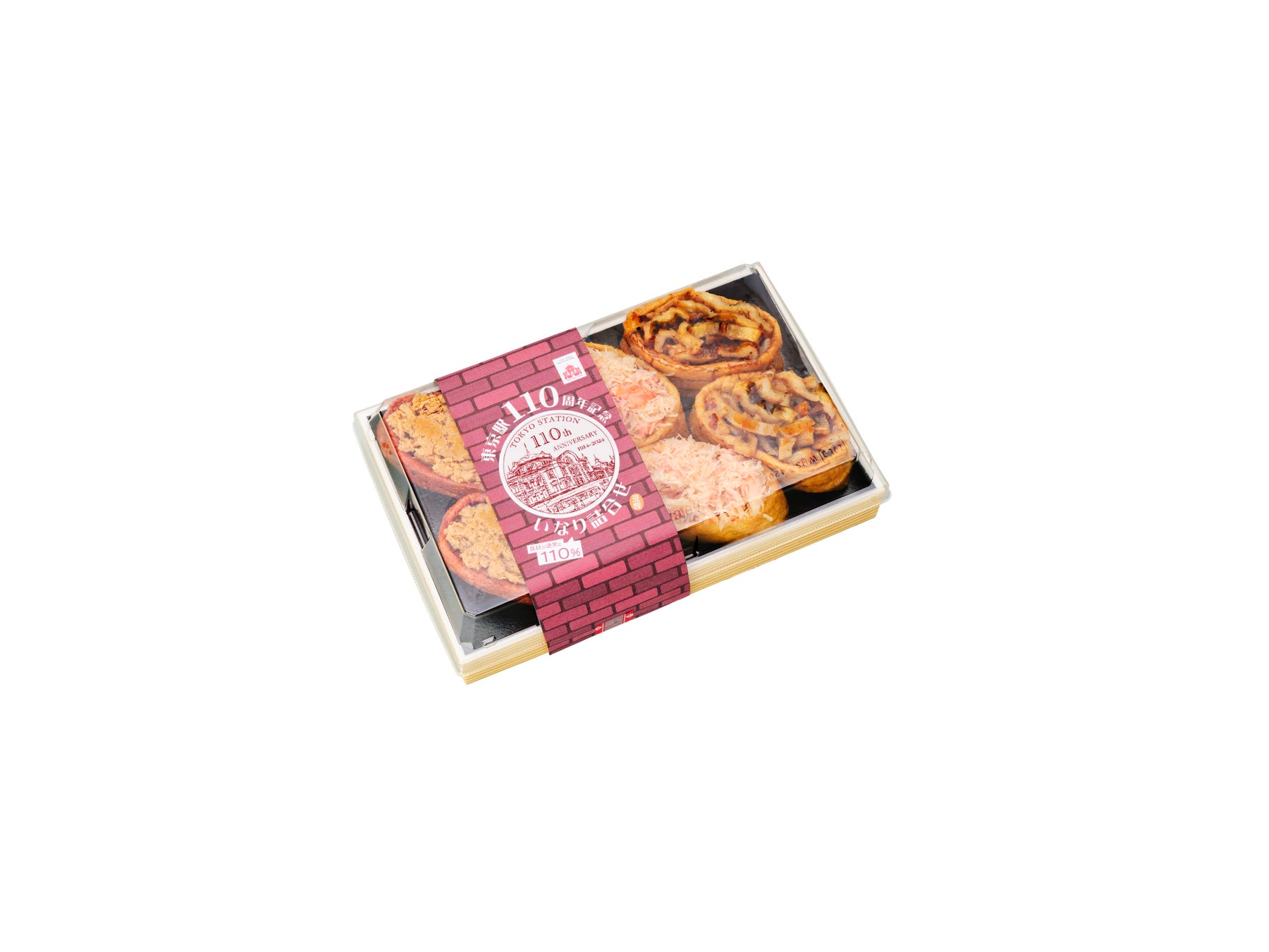 店内厨房で従業員がひとつずつ手握りして出来立てにこだわった、いなりすしの豆狸。赤いレンガ模様をあしらった110周年の限定掛け紙が目を惹く容器に、人気のいなりを詰め合わせました。東京駅丸の内駅舎のレンガ模様をイメージした『東京駅限定まぐろ時雨煮いなり』も入っており、110周年のお祝いムードを盛り上げてくれます。