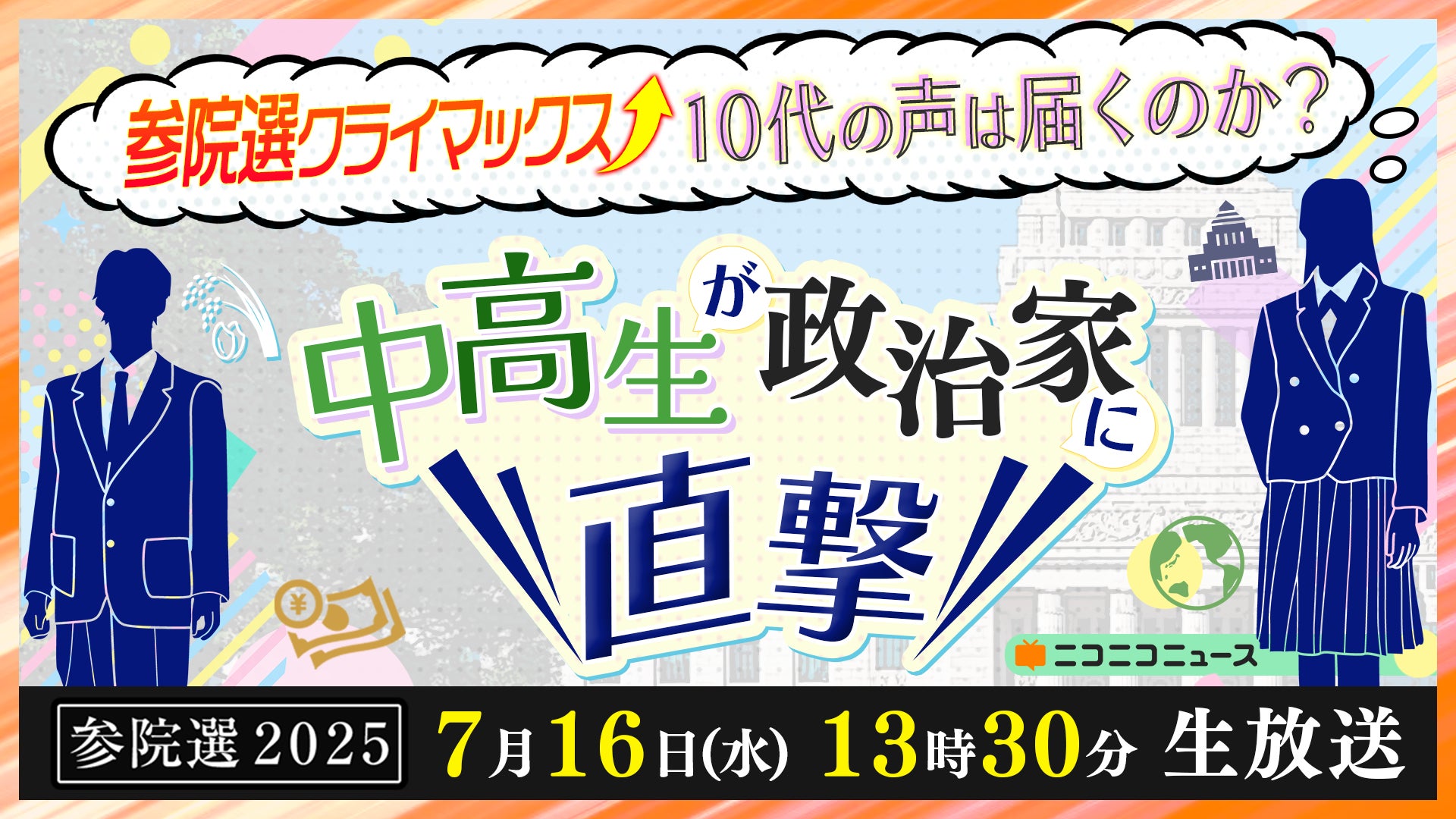 株式会社ドワンゴ(本社:東京都中央区、代表取締役社長:夏野剛)は、2025年7月16日(水)13時30分より、政治家と中高生による公開討論「【参院選クライマックス】10代の声は届くのか?中高生が政治家に直撃」を開催します。この模様は、同社が運営するライブ配信サービス「ニコニコ生放送」をはじめ、ニコニコニュースYouTube公式チャンネル、公式Xより生配信します。
