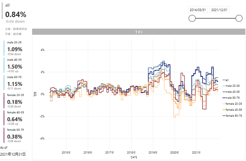 2021年10月1日の公表より、業態別のTPIは「スーパーマーケット」と「ドラッグストア」、TPI全体は「スーパーマーケット」「ドラッグストア」「コンビニエンスストア」「外食チェーン」でTカードが関与した購買金額を使用いたします。