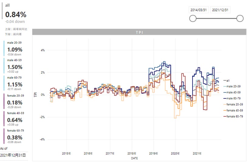 マーケティング・ソリューション事業を手掛けるCCCマーケティング株式会社とカルチュア・コンビニエンス・クラブ株式会社は、東京大学大学院 経済学研究科の渡辺努研究室との共同プロジェクトとして取り組む、Tポイントのデータを活用した物価指数「T-POINT Price Index(Tポイント物価指数)」(以下「TPI」)を発表しております。このたび、2021年12月度のTPIをお知らせいたします。