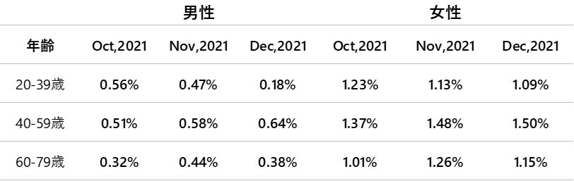 - 上昇率が最も大きいのは40~59歳・男性で1.50%、最も小さいのは20~39歳・女性で0.18%