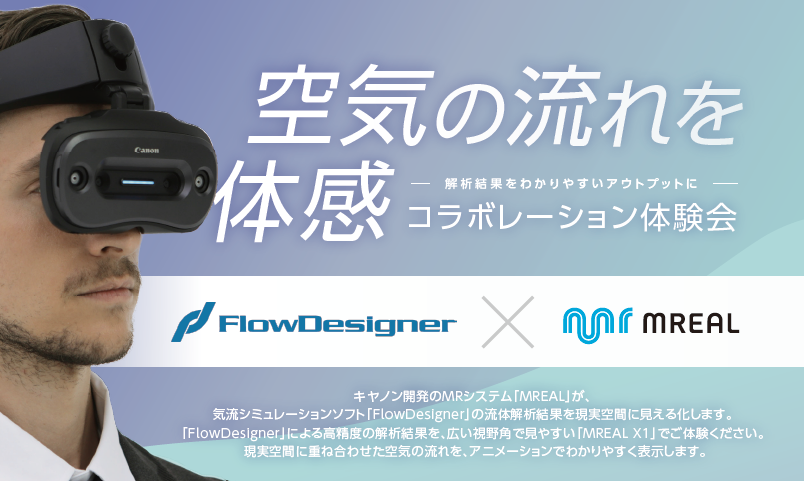 12月22日(木)、23日(金)開催の「FlowDesigner × MREAL コラボレーション体験会」の応募が多数だったため、追加での開催を決定しました。体験会では、キヤノンのMR(Mixed Reality)システム「MREAL」を用いて、アドバンスドナレッジ研究所が開発する気流シミュレーションソフト「FlowDesigner」の流体解析結果を現実空間に重ね合わせ、空気の流れをアニメーションで分かりやすく表示するデモを行います。広い視野角が特長の最新モデル「MREAL X1」で、臨場感のある表示と革新的な解析検証環境を体験いただけます。