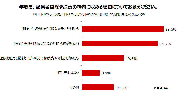 - 配偶者控除や扶養の枠内に収める理由 「得する」38.5%、「心理的抵抗がある」35.7%