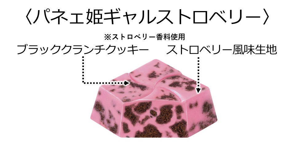 ストロベリー風味生地とザクザク食感が楽しめるブラッククランチクッキーを組み合わせることで見た目がピンクと黒でヒョウ柄にみえるようにしました。