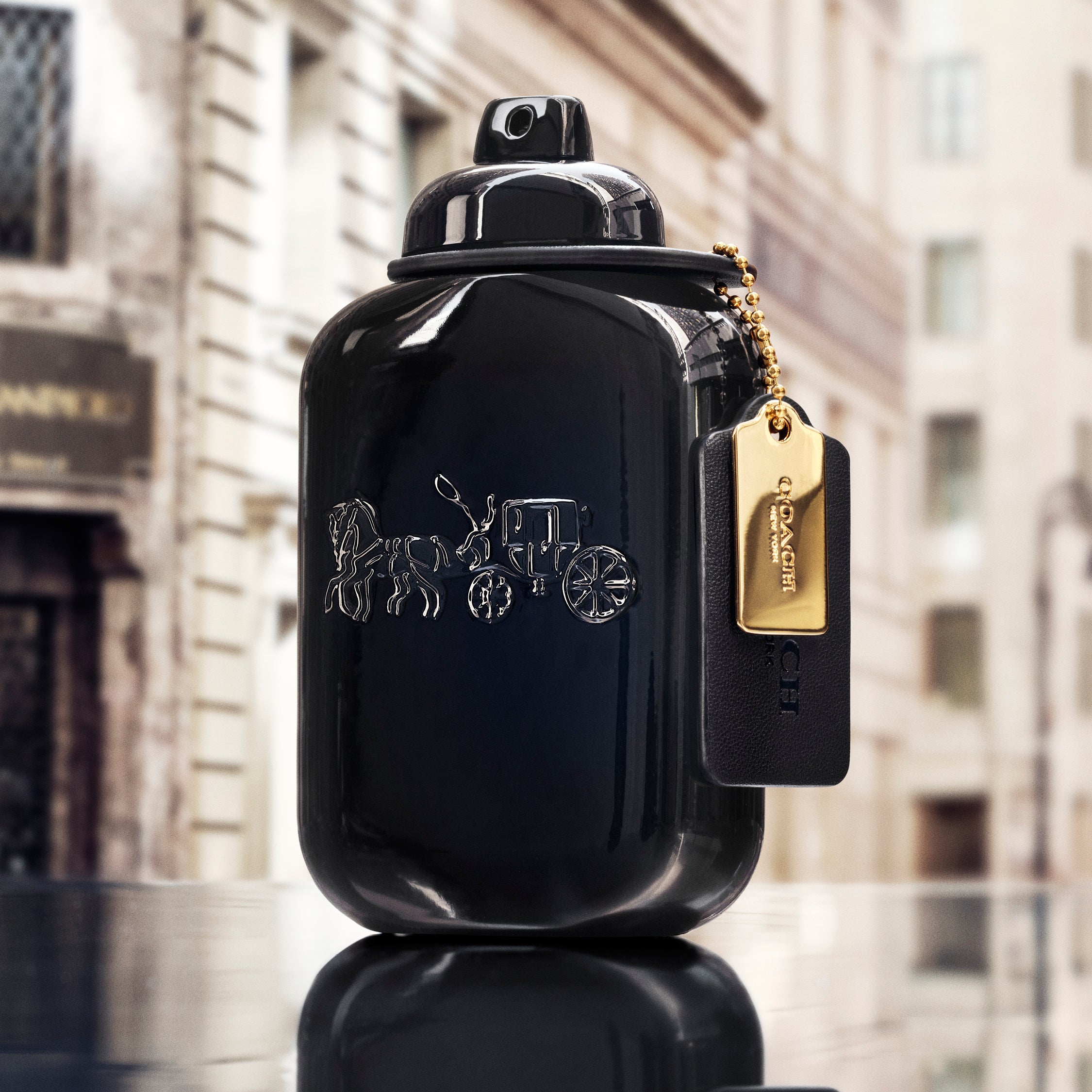コーチが誇るクラフツマンシップの豊かな伝統から着想を得たボトルには、ブランドのトレードマークである「ホース アンド キャリッジ」をブラックラッカーで刻み、ブラックレザーのハングタグを付けました。アンティークの薬瓶を想起させるボトルにゴールドのメタルプレートとターンロックのスプレーキャップをあしらい、ヴィンテージ感を演出。