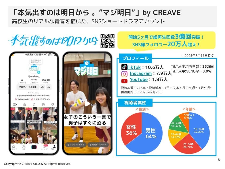 こうした背景を受け、CREAVEは視聴者が物語に自然に入り込み、ブランド体験できるバーチャルショートドラマ(VSD)形式の自社IP『本気出すのは明日から。”マジ明日”』を展開。開始5ヶ月で総再生回数3億回・SNSフォロワー20万人突破という実績を背景に、商品やサービスを自然に登場させるプロモーションプランの提供を開始しました。