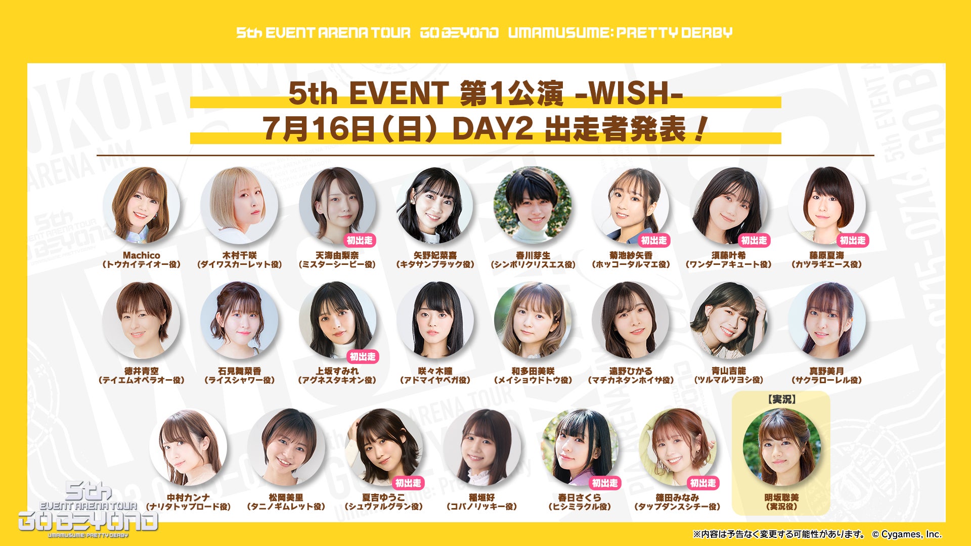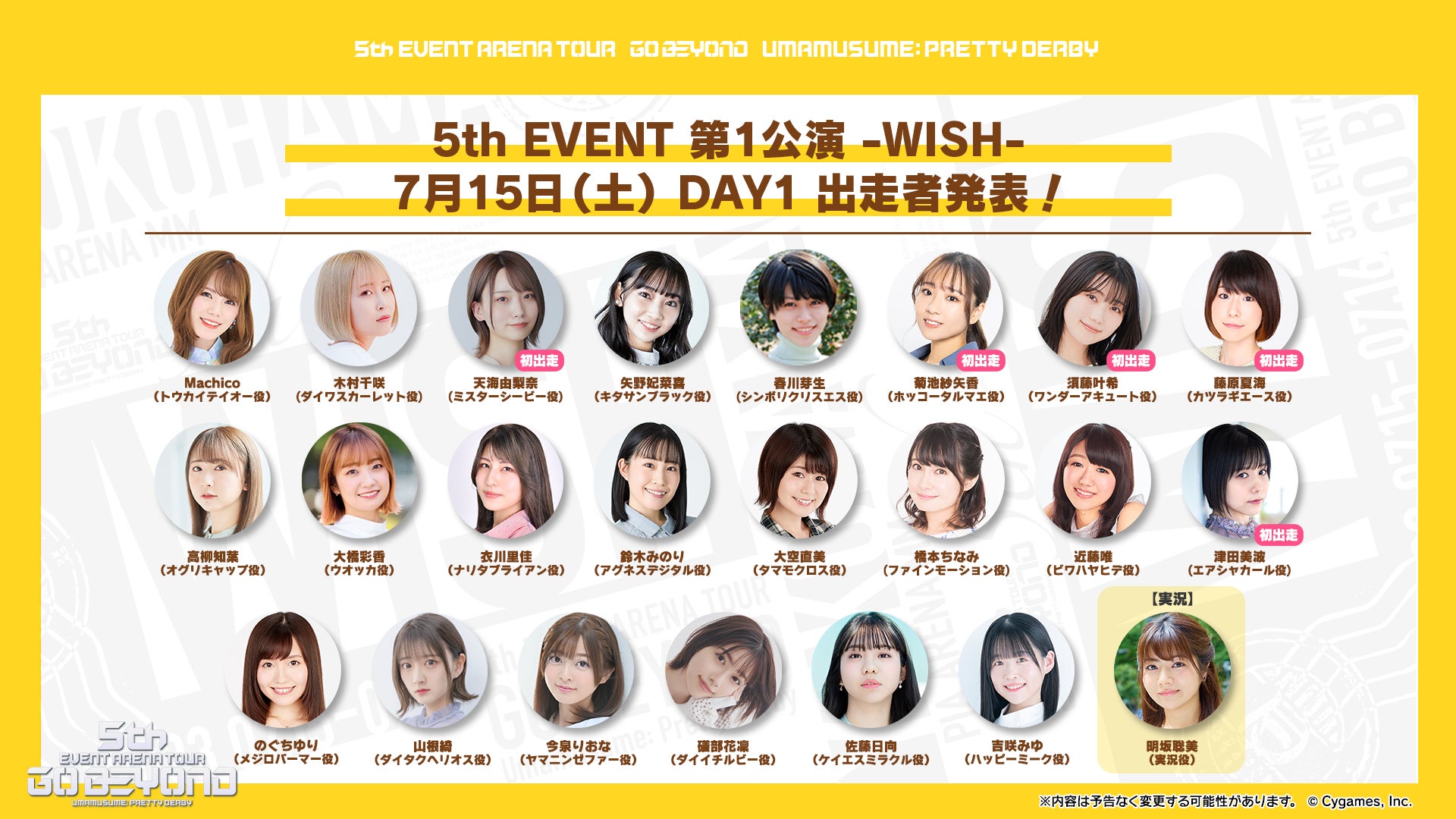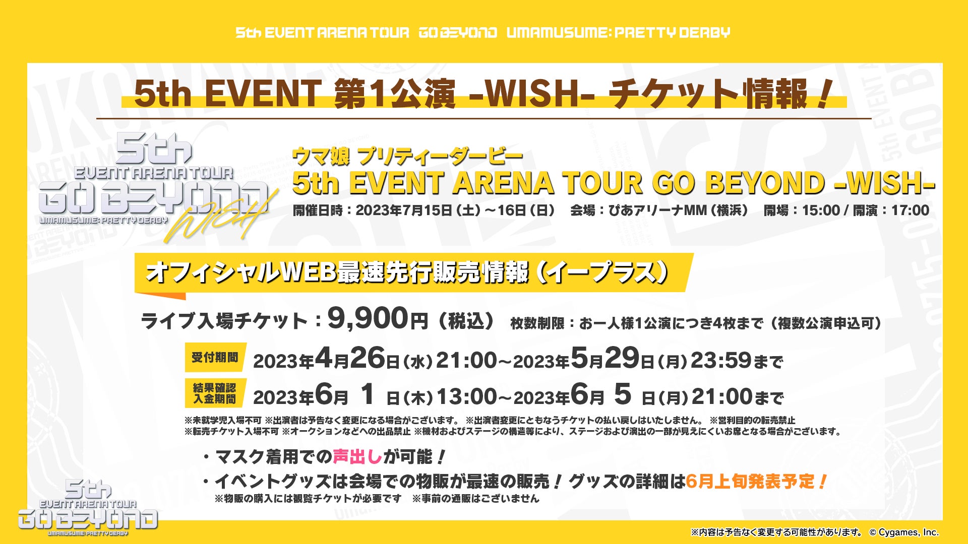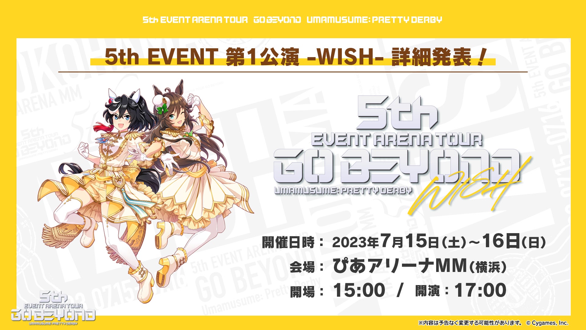 第1公演は、2023年7月15日(土)、16日(日)に横浜のぴあアリーナMMで開催予定です。公演名は「ウマ娘 プリティーダービー 5th EVENT ARENA TOUR GO BEYOND -WISH-」です。