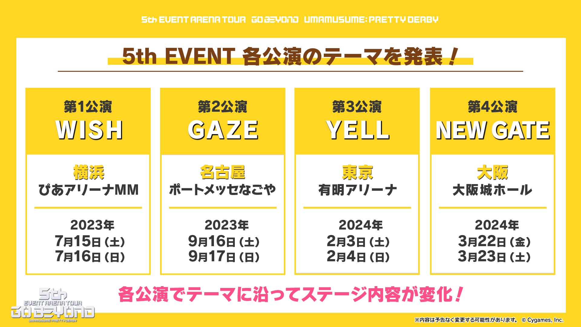 『ウマ娘』ではこれまで東京や横浜といった関東圏でナンバリングイベントを実施してまいりましたが、このたび横浜、名古屋、東京、大阪の4つの都市にて、それぞれイベントを開催することになりました。各公演ごとに、「WISH」「GAZE」「YELL」「NEW GATE」というテーマが決められており、このテーマに合わせて各ステージの内容も変化するのが大きな特徴です。第1公演は、7月15日(土)・16日(日)に横浜の「ぴあアリーナMM」で開催します。