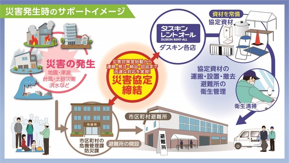 株式会社ダスキン(本社:大阪府吹田市、社長:大久保 裕行)が展開する、レントオール事業(イベント総合サポートと各種用品のレンタルサービス)は、災害発生時に自治体の避難所開設に必要な施設衛生サービスと、約100種のレンタル商品を全国102拠点のネットワークを活用して敏速※にサポートする『防災サポートサービス』の提供を、7月1日(金)から全国の拠点で開始します。また、災害発生時に備えた防災訓練会場の設営・衛生対策・資機材レンタルもサポートすることで、地域の安全・安心に貢献してまいります。