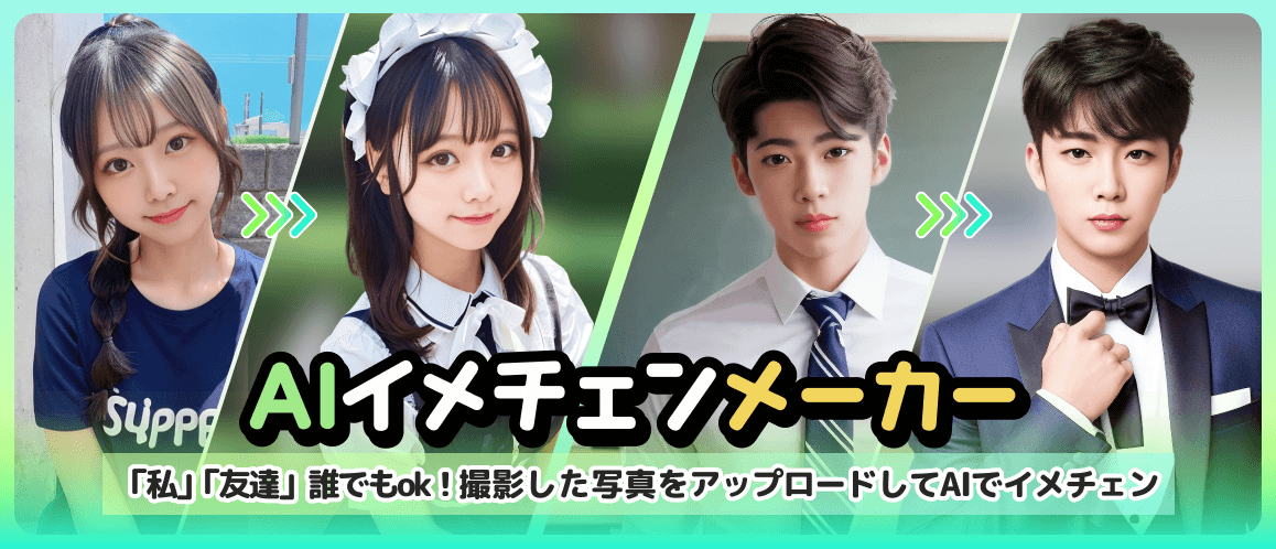 今話題の画像生成AIを活用した機能です。AIイメチェンメーカーに顔写真をアップロードするだけでSimejiAIが画像を生成!「メイド風(男女)」・「執事風(男女)」・「アニメ風」の5種類のフィルターをご利用いただけます。