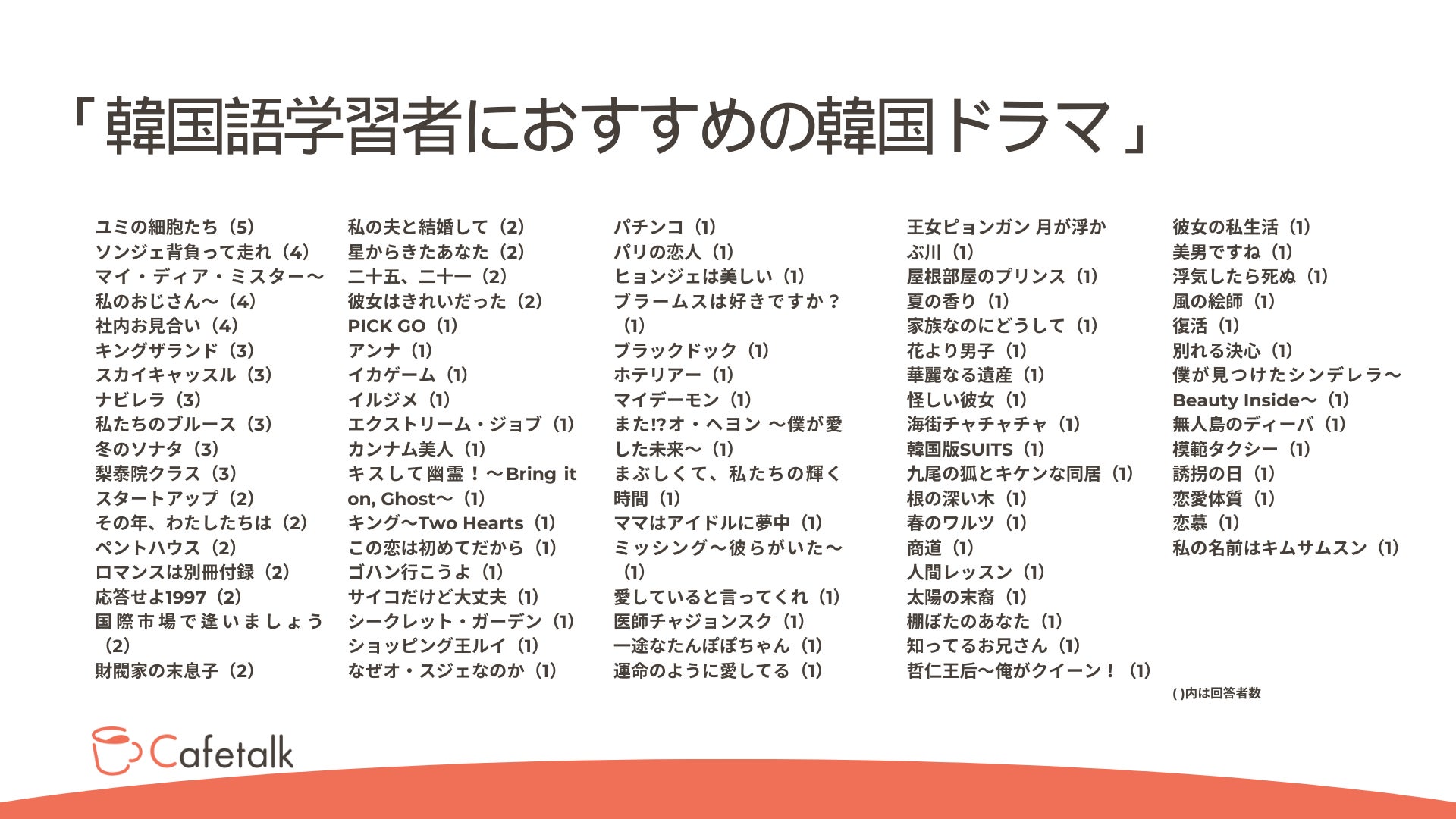 など、韓国語特有とも言える、カジュアルな表現と、合わせて目上の方に使う敬語の使い合わせ、使い分けについてドラマから学べるという点を理由が多く挙げられました。