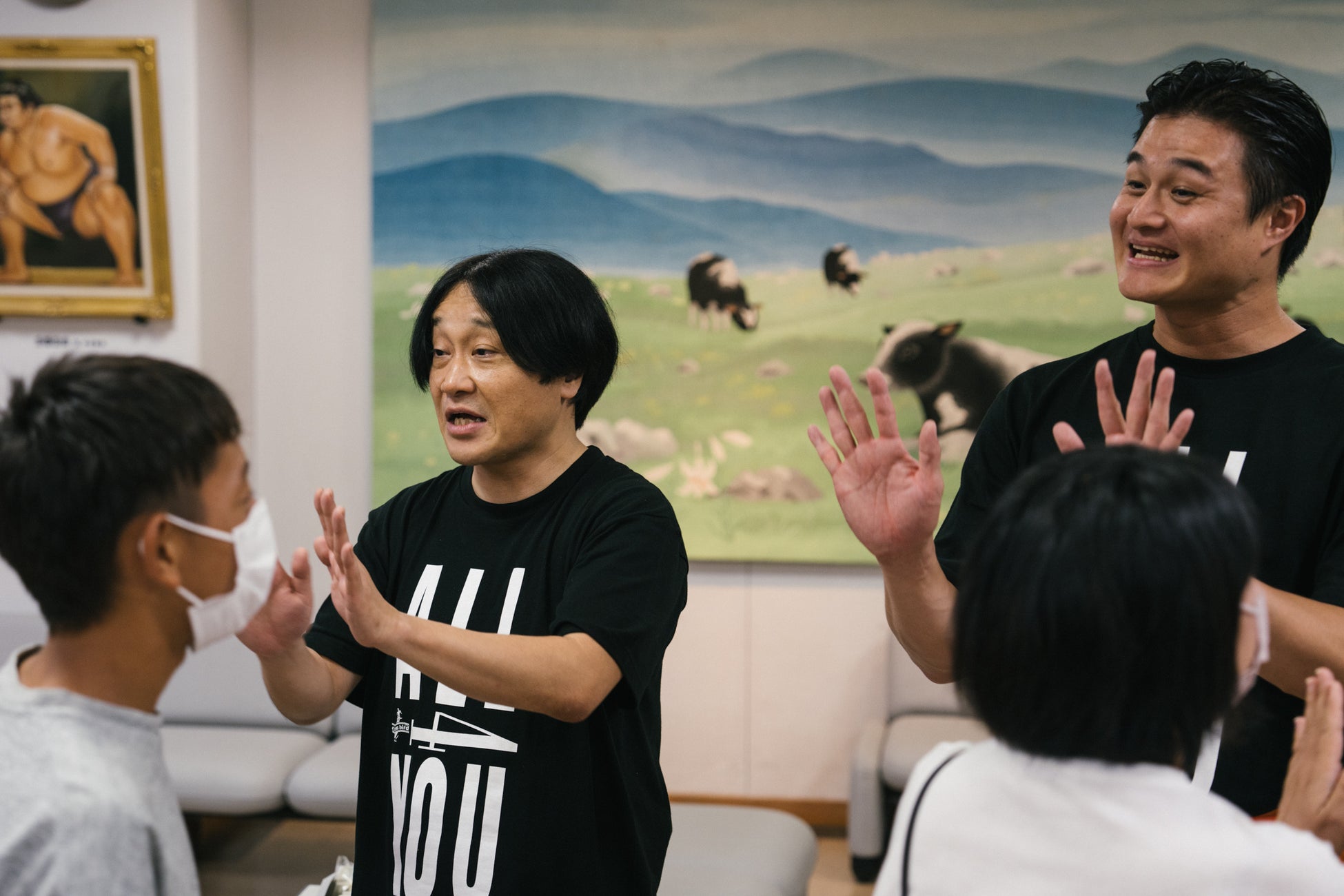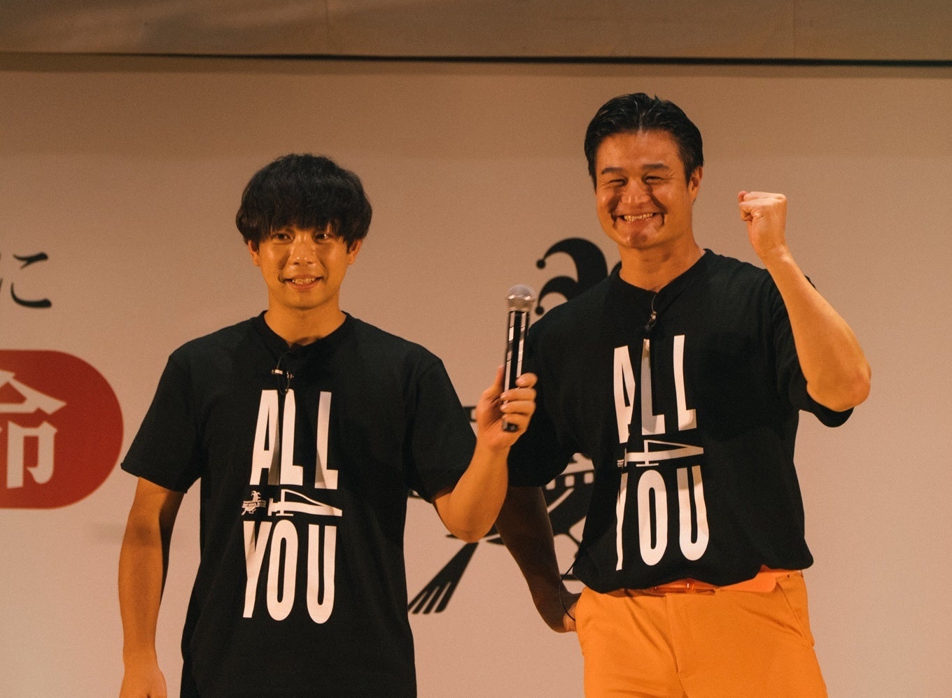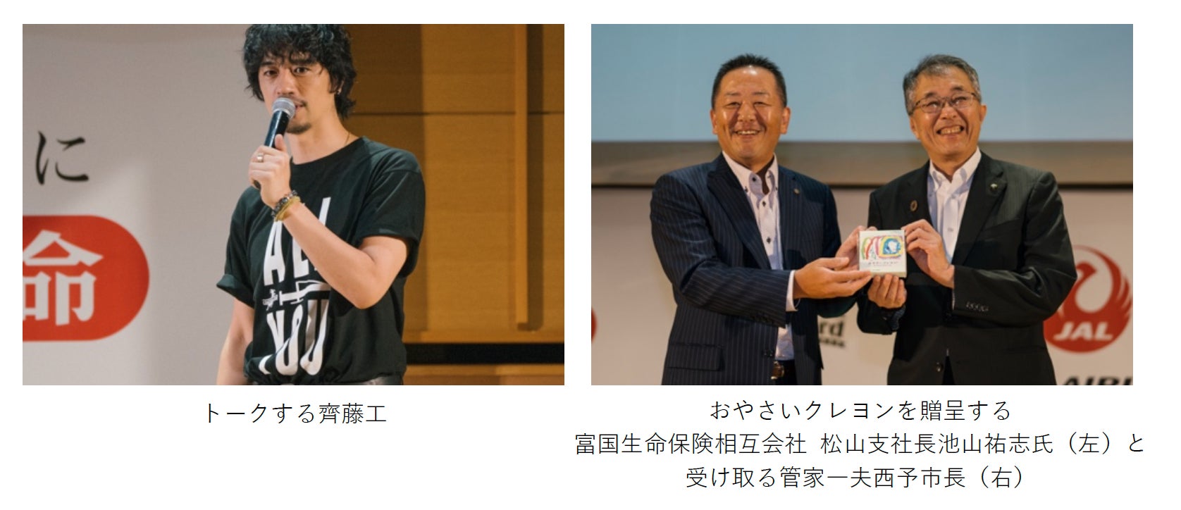 今回の開催にあたり発起人である齊藤工は「6年前の豪雨災害の傷が癒えてない人もいるかもしれない。復興のシンボルの地で、少しでも楽しい思いをしてもらえたらと思っています。」と西予の地でイベントを開催する想いを語りました。そして愛媛県濱里要副知事が、公務で登壇が叶わなかった中村時広知事のメッセージを代読。メッセージでは「ここ西予市野村町は、豪雨災害から地域一丸となって『のむら復興まちづくりデザインプロジェクト』を立ち上げられ、被災の記録と記憶を継承しつつ、災害に強い未来志向の街づくりを進められていることに深く敬意を表します。ここの会場は、地域を愛する皆さんの想いが込められた施設。このような場所で多くの方と感動を共有し“愛顔”が育まれる意義深いプロジェクトが実施できることを大変嬉しく思います。」と開催の喜びを伝え、西予市管家一夫市長は「ここの会場も様々な方の力を借りて令和2年に復興することができました。このような夢と希望が溢れるイベントを実施していただき、西予市も未来へ進むことができる。この素晴らしいイベントが日本の隅々に広がり、もっとたくさんの方に感動を与えてくれることを願っています。」と感謝を伝えました。愛媛県議会議員の兵頭竜氏は「西予市は一歩ずつ着実に復興の道を歩んでいます。今日もまた復興の一歩になる、そんな日になると思っています。今日をきっかけに明日からの西予、そして愛媛を拓いていきたい。」と述べました。また、特別協力の富国生命保険相互会社 松山支社長池山祐志氏が登壇。同社は2023年11月に創業100周年を迎え、「THE MUTUAL(ザ ミューチュアル)」というコンセプトのもと実施されているプロジェクトのひとつ「THE MUTUAL Art for children(ザ ミューチュアル アート フォー チルドレン)」という社会貢献プロジェクトの一環で、収穫する際に捨てられてしまう野菜を原材料とした「おやさいクレヨン」を製作されています。パッケージは特別支援学校の生徒のデザインを採用しているといい、この度「おやさいクレヨン」を西予市へ贈呈いただきました。