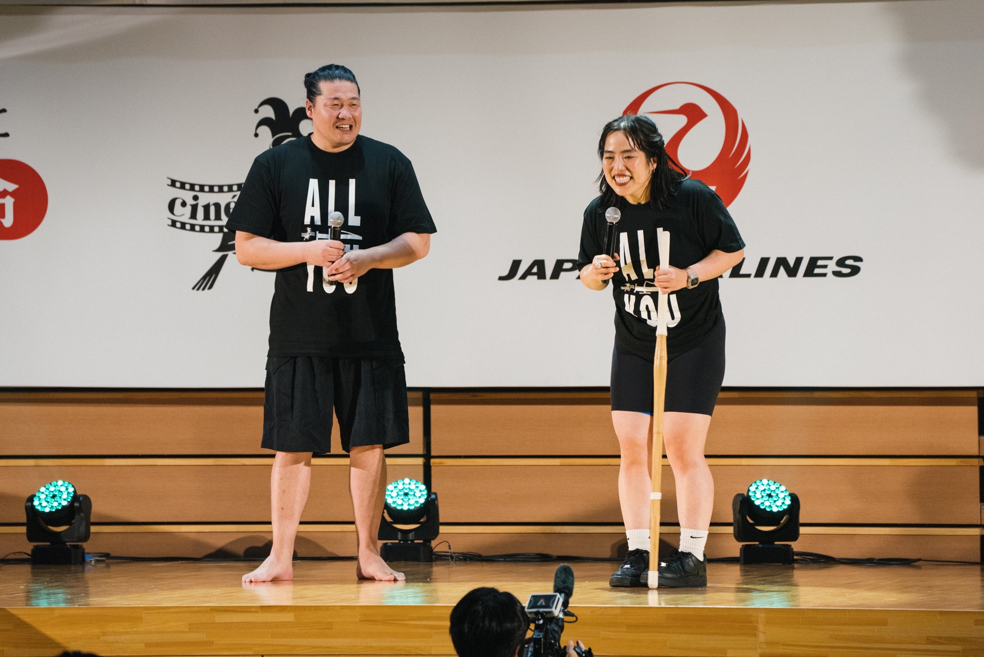 開催地である西予市は、江戸時代から170年続く乙亥大相撲を開催していることでも知られています。現在、プロ力士とアマチュア選手との取組が行われる全国で唯一の大会で、地域の大切な伝統行事です。齊藤工はそんな相撲に所縁のある西予市で上映する映画に、周防正行監督がメガホンをとり、本木雅弘が主演した1992年に放映した映画『シコふんじゃった。』を選びました。本作は卒業のための単位と引き換えに、廃部寸前の弱小相撲部に入部することになった大学生の奮闘をコミカルに描いた青春コメディ。第16回日本アカデミー賞では最優秀作品賞にも輝いています。この日ゲストとして、同じく相撲の世界を描き世界中を熱狂させた、昨年配信スタートのNetflixドラマ「サンクチュアリ-聖域-」で主演を務め大ブレイクした一ノ瀬ワタルが登場!ドラマで演じた猿桜さながらの一ノ瀬の登場に会場からは大歓声が!ステージの真ん中で蹲踞の姿勢を披露した一ノ瀬は「いや〜緊張するっすね〜!久々に猿桜を降ろさせてもらったんですけど、楽しかったっすな!」と一ノ瀬節を発揮すると、齊藤は「ここの会場は土俵にもなるんです。その会場に一ノ瀬さんが降臨するっていうのがまた意味深いですね。」とコメントすると、会場からは拍手が巻き起こりました。そして、同じくNetflixドラマ「極悪女王」の演技が大反響を呼んでいるゆりやんレトリィバァも再び竹刀を振り回して大暴れ!劇中でも話題となっている“フォーク”も持参し、齊藤工の頭を刺すという衝撃パフォーマンスのパロディに会場はさらに盛り上がりを見せました。さらに、乙亥会館の隣にある復興公園「どすこいパーク」では、『ザ・スーパーマリオブラザーズ・ムービー』を手掛けたイルミネーションが贈る、7年ぶりの完全オリジナルストーリー『FLY! フライ!』を上映。いつもの公園が野外映画館に様変わりした風景に、来場した家族らは秋の夜風を感じながら楽しみました。
