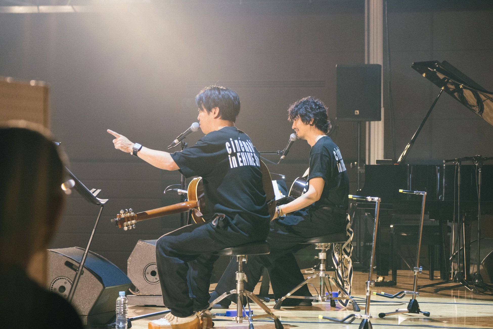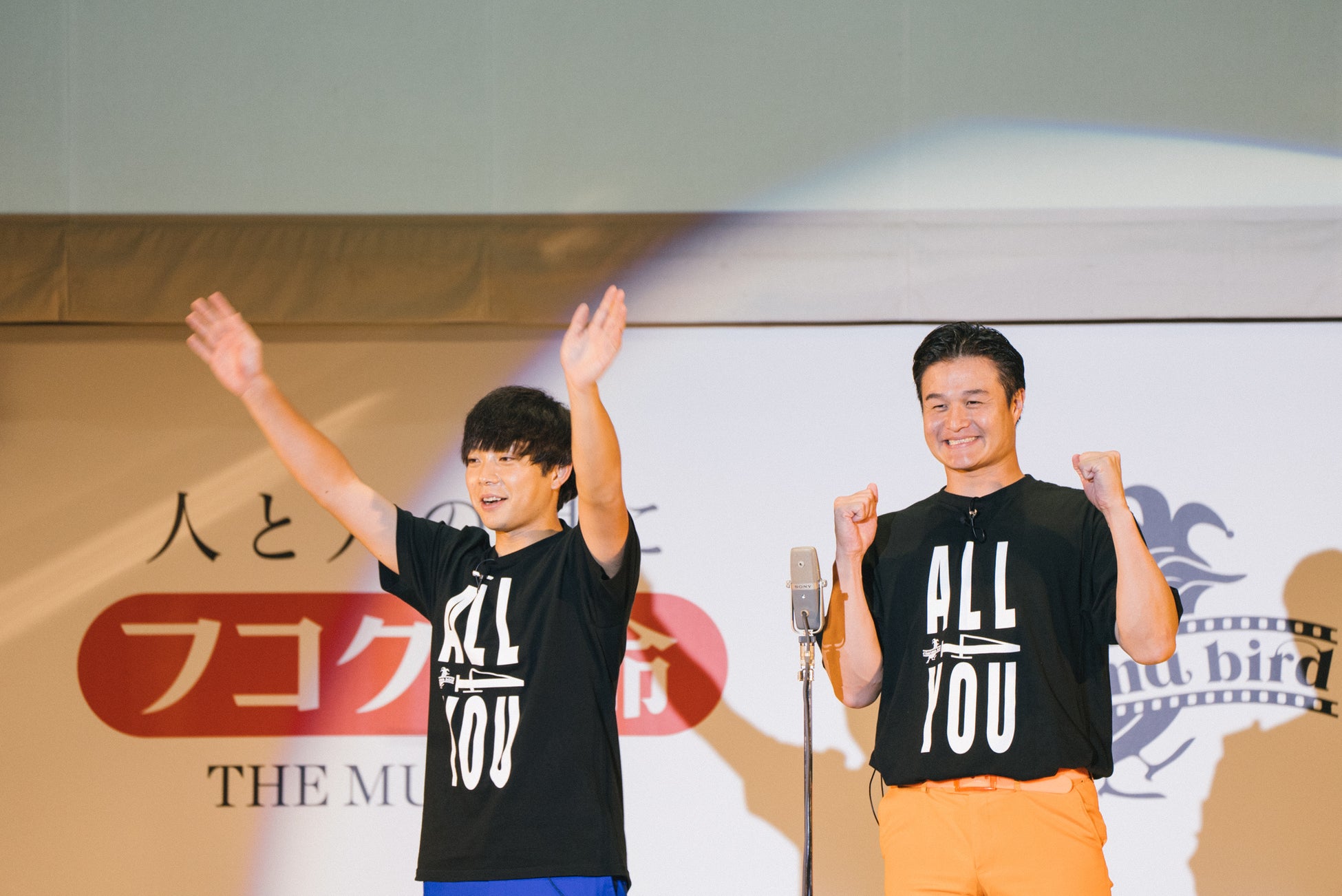 最初に登場したのはティモンディ。前田は「やっぱり帰ってきたという気持ちになる」と凱旋ライブに思いを馳せ、高岸が「ただいま〜!」と大声で挨拶すると、観客は「おかえり〜!」の声と温かい拍手で歓迎。「ここ野村は(野球に)負けるたびにいろんな坂を走らされた。一生忘れません!」と笑顔でコメントし笑いを誘いました。そして高岸が「皆さんとは同じ空間、同じ時間を過ごしている時点で仲間なので、今日からみなさんティモンディです。ティモンディ西予市部として、心一つにしたいと思います!やれば〜」と叫ぶと、観客から「できる〜!」というコールアンドレスポンスを繰り返し、会場に一体感が生まれました。