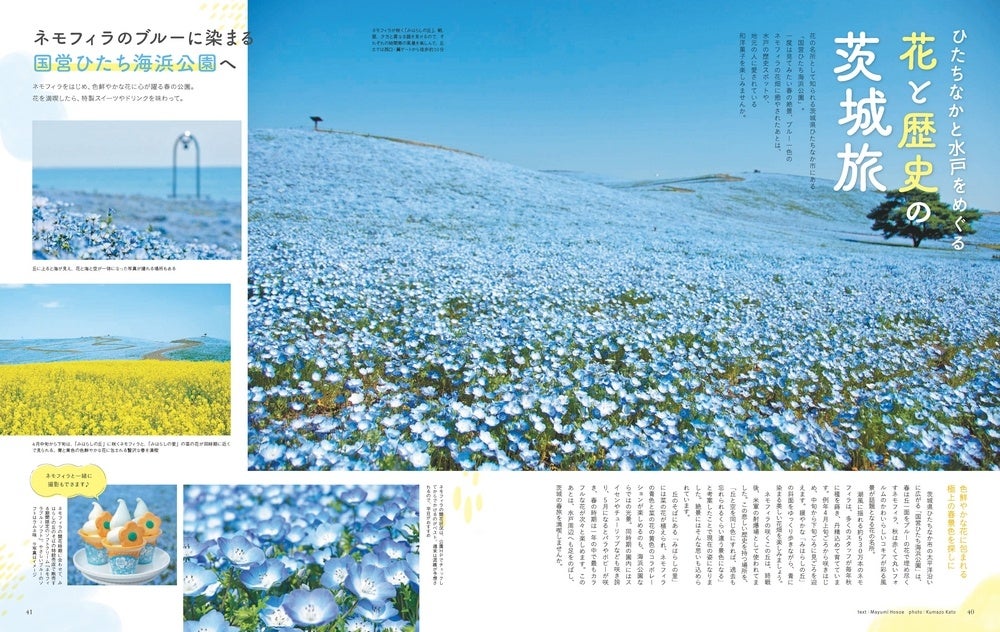 ◆茨城県ひたちなか市の太平洋沿いに広がる「国営ひたち海浜公園」は、春は丘一面をブルーの花で埋め尽くすネモフィラ、秋は赤くて丸いフォルムのかわいらしいコキアが彩る風景が話題となる花の名所。潮風に揺れる約530万本のネモフィラは、多くのスタッフが毎年秋に種を蒔き、丹精込めて育てている。ここを訪れたあとは水戸周辺へも足をのばし、茨城の春旅を満喫。(茨城)