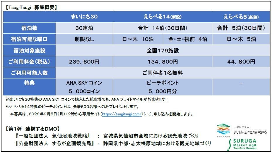 当社が提供している定額制回遊型住み替えサービス「TsugiTsugi」(ツギツギ)(以下、本サービス)は、2022年10月から新たに一般社団法人気仙沼地域戦略や公益財団法人するが企画観光局といった観光地域づくり法人(以下、DMO)との連携、Peach Aviation 株式会社(以下、Peach)との提携、株式会社 日本経済新聞社(以下、日経)が運営するシェアオフィスサービス「OFFICE PASS」との提携を開始します。