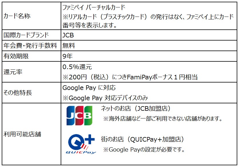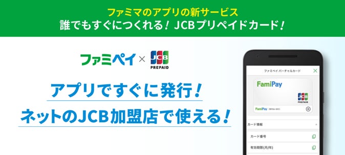 このたび、ファミマデジタルワンがサービスを開始する「ファミペイ バーチャルカード」は、ファミマのアプリ「ファミペイ」で発行するJCBプリペイドカードです。