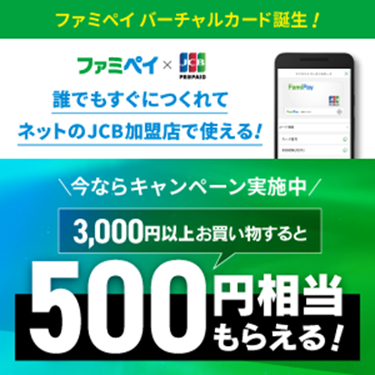 ファミペイ バーチャルカードを使って、ネットのお店(JCB加盟店)で3,000円以上利用すると、ファミペイボーナス500円相当を進呈いたします。