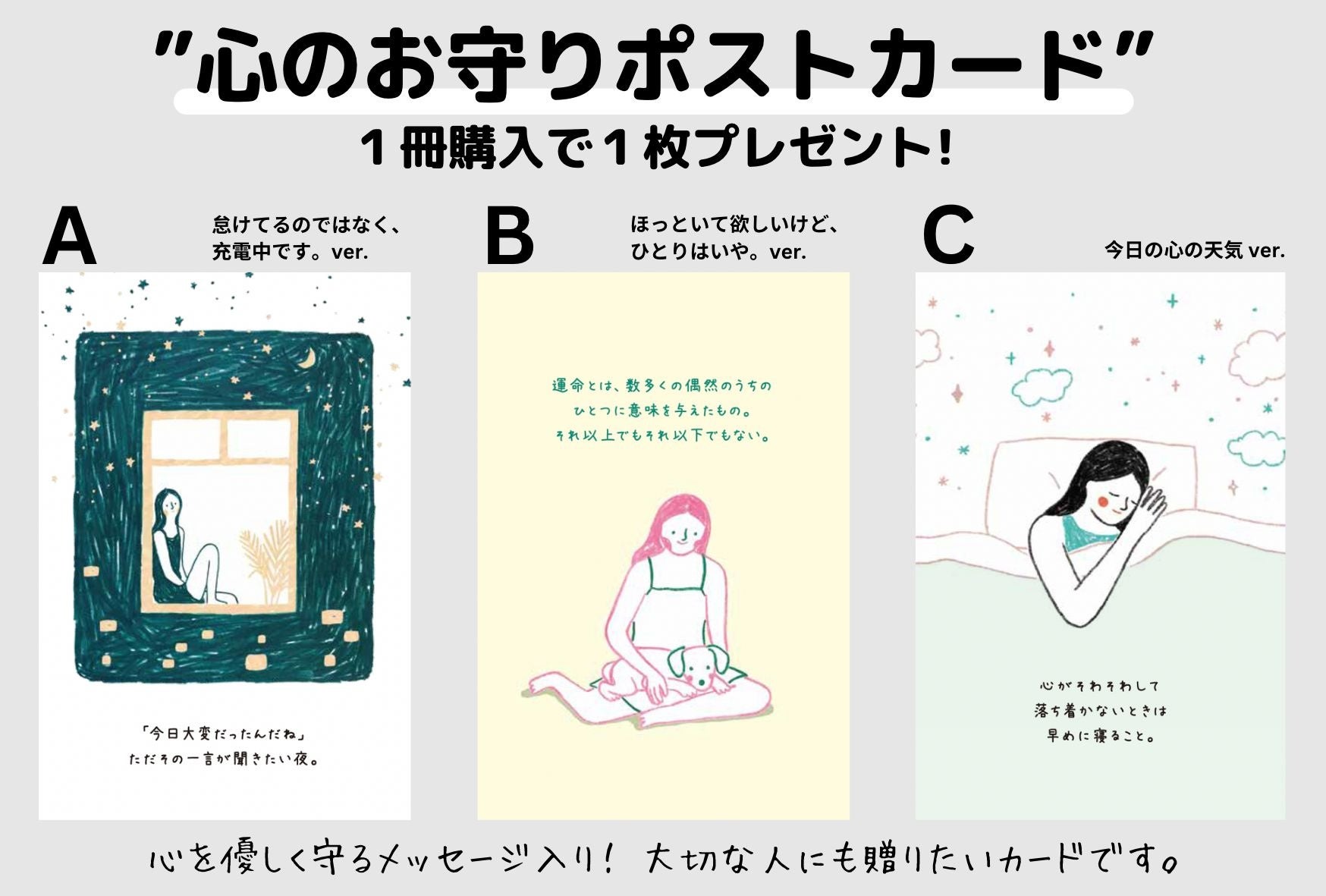 書籍『今日の心の天気』、『怠けてるのではなく、充電中です。』、『ほっといて欲しいけど、ひとりはいや。』をキャンペーン参加書店でお買い上げのお客様に、1冊につき1枚、店頭・または配送にて限定「心のお守りポストカード」を差し上げます!