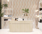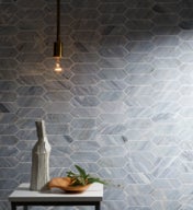 水磨き仕上げによるしっとりとしたやさしい光沢をもつ変形六角形が特⻑の大理石モザイクです。美容院やコスメショップなど清潔感のある店舗の内壁アクセントやホテルのレセプション、パウダールームなどで高級感を演出します。