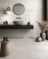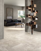 トラバーチンがモチーフで脈模様が見えるベインカットと、それを横断するようにカットしたクロスカットの2種類の柄模様がある大形形状のタイルです。