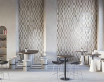 内装壁タイルでは、クリア・ラスター・メタルという3種類の異なる表情を持った「ピケットガラス」、しっとりとしたテクスチャーと個性的な形状が特長の大理石モザイク「ピケットマーブル」などの4商品をラインアップします。また床タイルでは、表面の柄と凹凸が一致した最新の加飾技術により、大理石やトラバーチンといった大胆な柄を表現した「ミリオルマルモ」や「デュエトラベルチーニ」などの4商品をご用意しています。