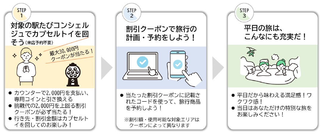 東北や北陸、首都圏の人気宿泊施設で平日に利用可能な最大30,000円分の割引クーポン(※)が当たるカプセルトイを駅たびコンシェルジュに設置します。数量限定ですので、ぜひお早めにご来店ください。