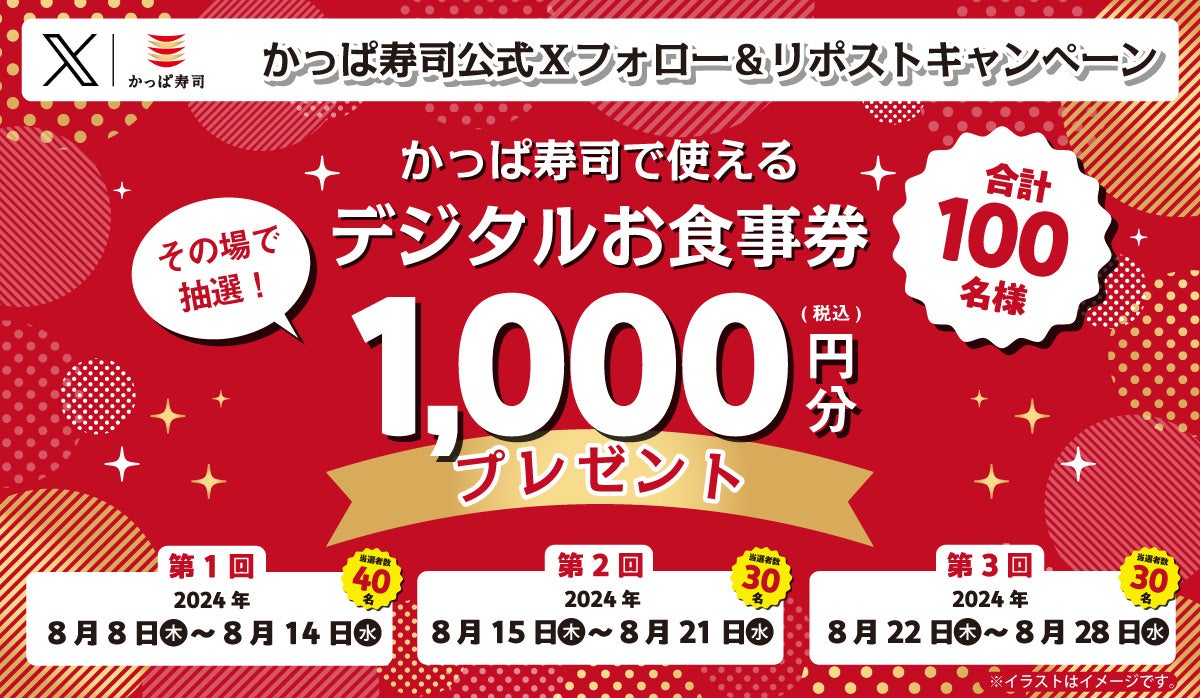 2024年8月8日(木)~8月28日(水)の期間、かっぱ寿司公式X(@kappasushi_jp)をフォローし、該当の投稿をリポストされた方の中から抽選で合計100名様に、かっぱ寿司全店でご利用いただける「デジタルお食事券1,000円分」をプレゼントいたします。
