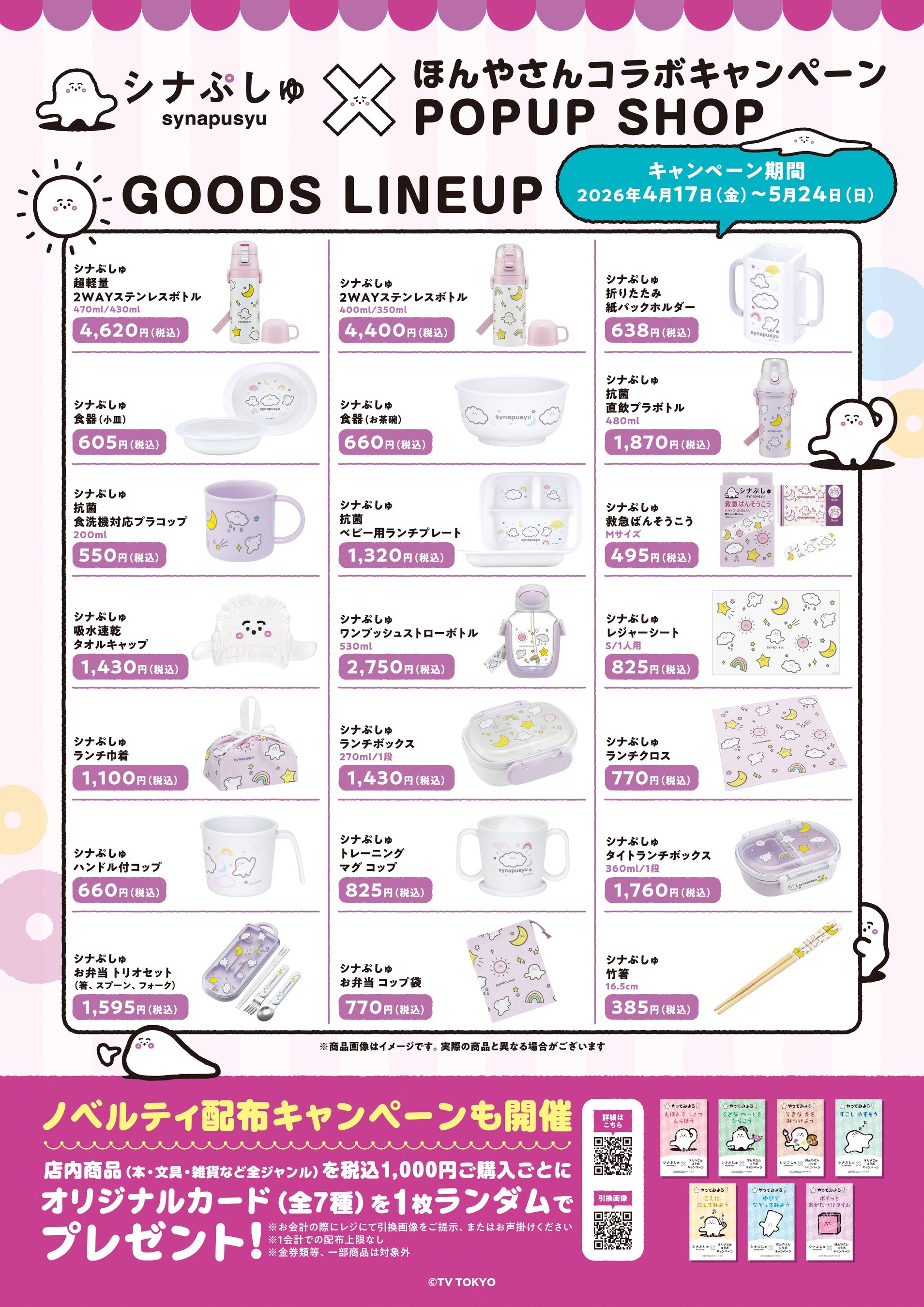 本キャンペーンは、テレビ東京系列6局ネットにて放送中の乳幼児向け番組「シナぷしゅ」とコラボレーションし、番組のメインキャラクター「ぷしゅぷしゅ」のイラスト入りオリジナルカードのプレゼントをはじめ、「シナぷしゅ」関連書籍を集めたブックフェアや、一部店舗でのPOPUP SHOPの開催など、子どもの“ほんやさんデビュー”を応援する企画を行います。