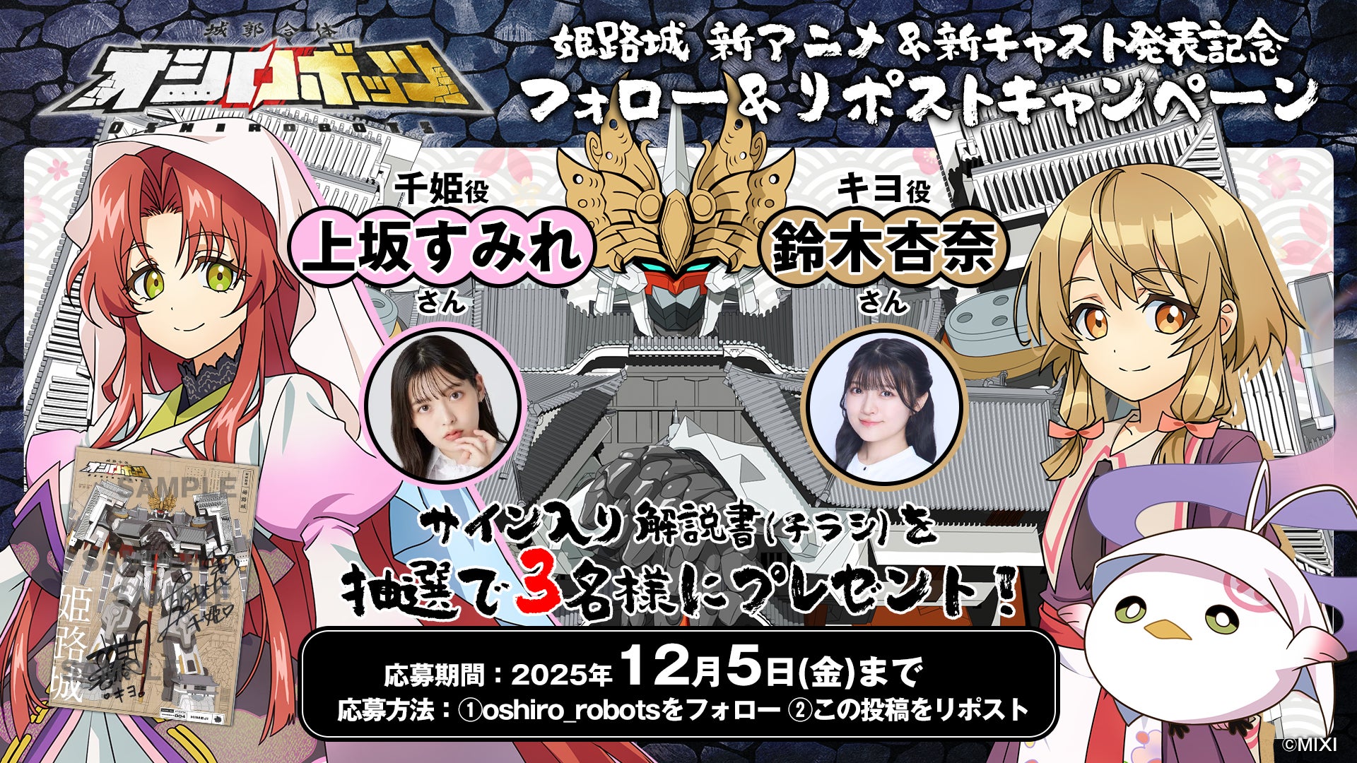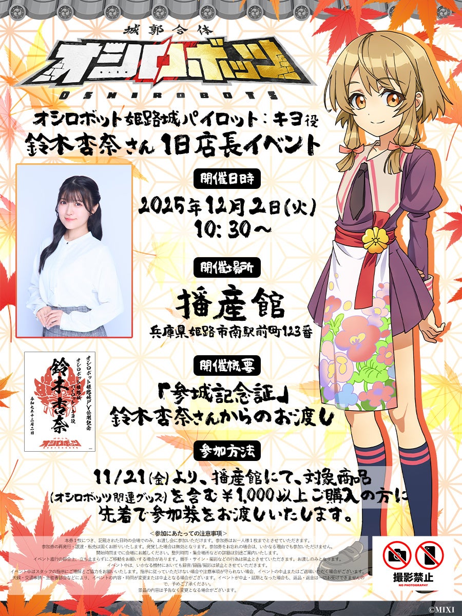 株式会社MIXI(東京都渋谷区、代表取締役社長 上級執行役員 CEO:木村 弘毅)は、MIXI_ANIMEオリジナルコンテンツ『城郭合体オシロボッツ』において、鈴木杏奈さんと上坂すみれさんをキャストに迎えて制作したオシロボット姫路城の完全新作アニメPVを公開しました。新作公開を記念し、2025年12月2日(火)に兵庫県姫路市「播産館」にて、オシロボット姫路城パイロット・キヨ役を演じる鈴木杏奈さんによる1日店長イベントを開催します。また、新キャスト発表記念として、鈴木杏奈さんと上坂すみれさんのサイン入り解説書が当たるキャンペーンも実施します。