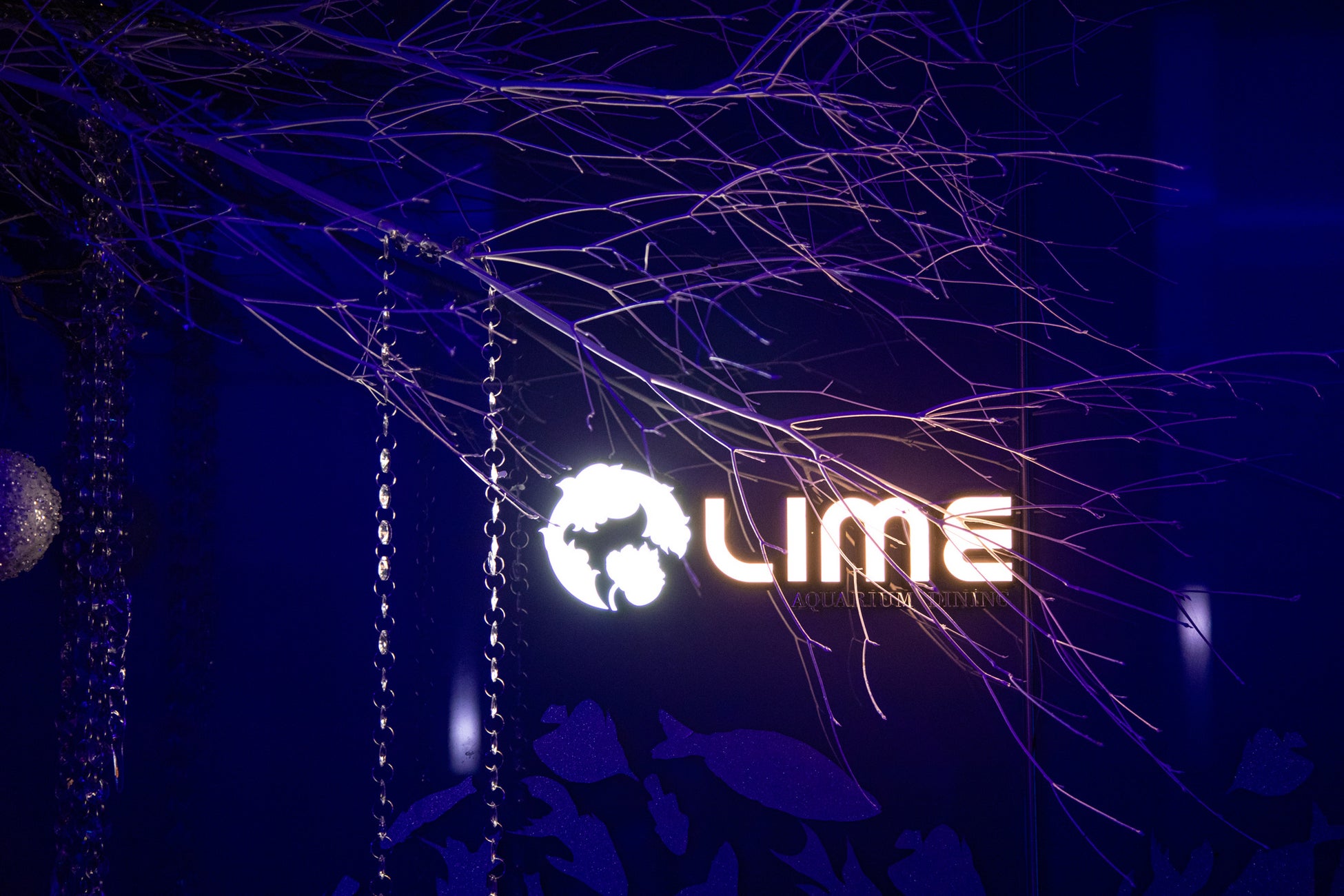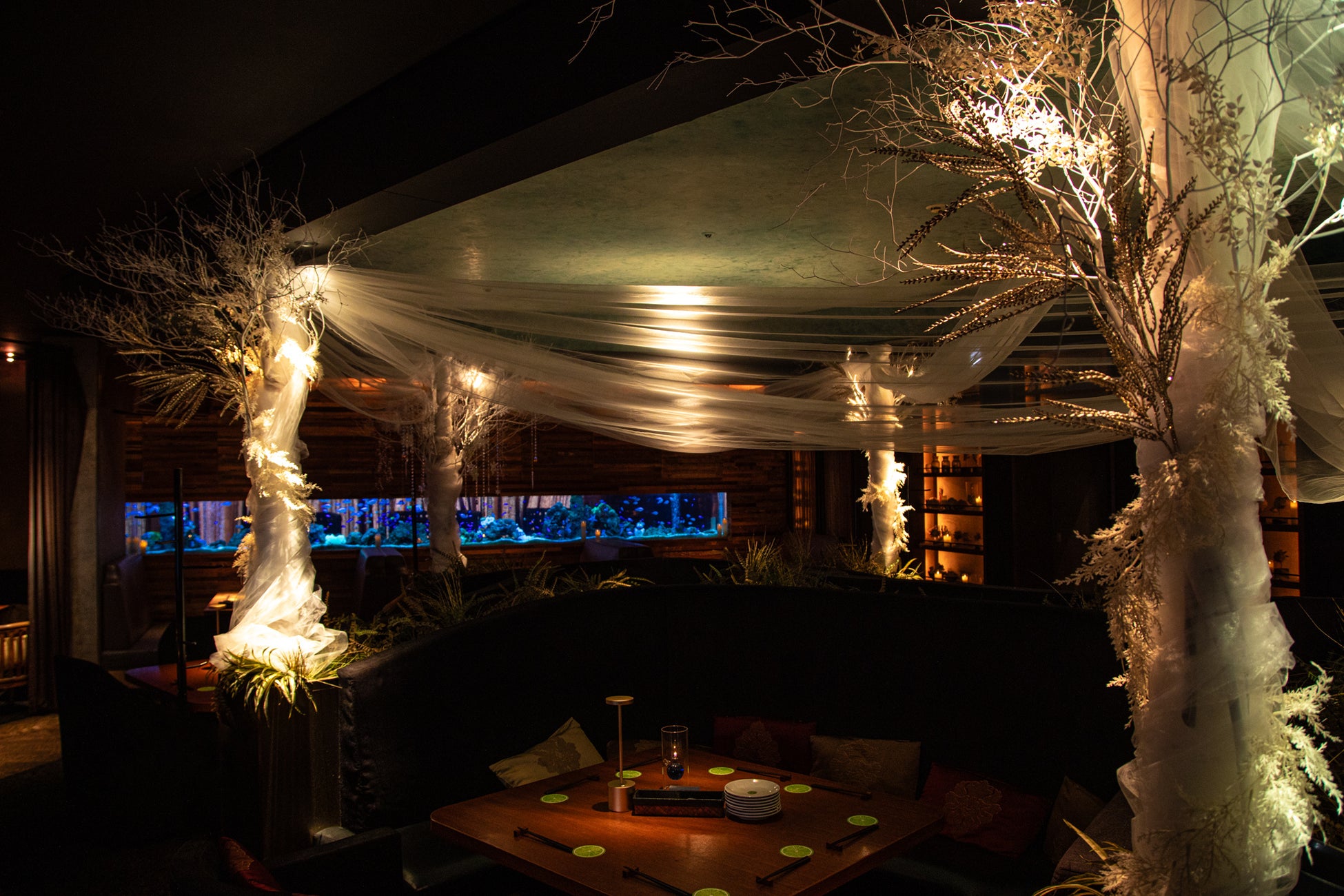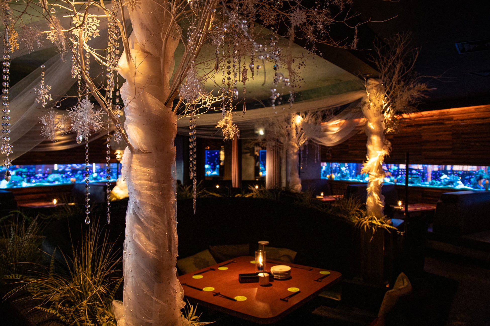 エントランスを抜け、天井まである重々しい木の扉を開けるとクリスマスムードを盛り上げる圧倒的な装飾に目を奪われる。さらに新宿ライムを象徴するアクアリウムから溢れるやわらかな光とキャンドルの揺らめく光が混ざり合い、店内はより一層、幻想的で非日常を感じることができる上質な大人の空間となっている。イルミネーションが輝く光の空間で店内全体がフォトスポットに、