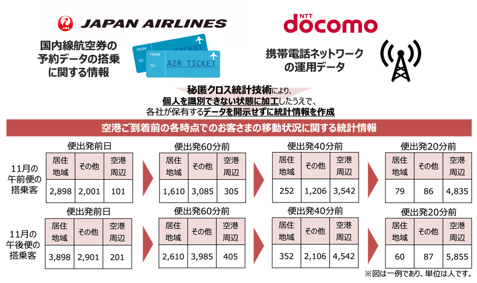 本実証実験では、ドコモが日本電信電話株式会社の協力を得て開発した秘匿クロス統計技術(以下、本技術)を用いて、各社が保有するデータを各社において、個人を識別できない状態(個人情報ではない状態)に加工したうえで、データを相互に開示することなく、つまり、一連の処理を人の目に触れることなく機械が行なうことを保証して、航空機搭乗前のお客さまのご移動状況に関する人口統計情報を作成し活用することで、スムーズな航空利用の実現を図ります。本実証実験で取り扱う各社の保有データは、JALが保有する国内線航空券の予約データの搭乗に関する情報とドコモが保有する携帯電話ネットワークの運用データ※1の一部(お客さまがご利用の携帯電話の位置データおよびお客さまの属性データ)です。