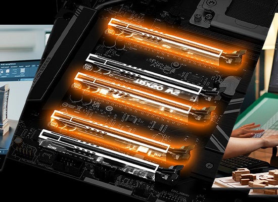 『TRX50 WS』は、3基の PCIe gen5 x16 スロットを搭載しており、PCIe 5.0の高いパフォーマンスでGPUやアドオンカードを支えます。