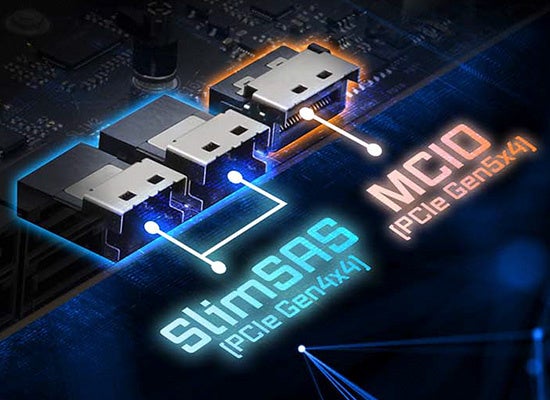 SlimSAS(SFF-8654)とMCIOのサーバーグレード接続ポートを搭載や128Gb/sの転送速度のPCIe Gen5 ブレイジング M.2を搭載しており、高速かつ安定したストレージ拡張を実現。
