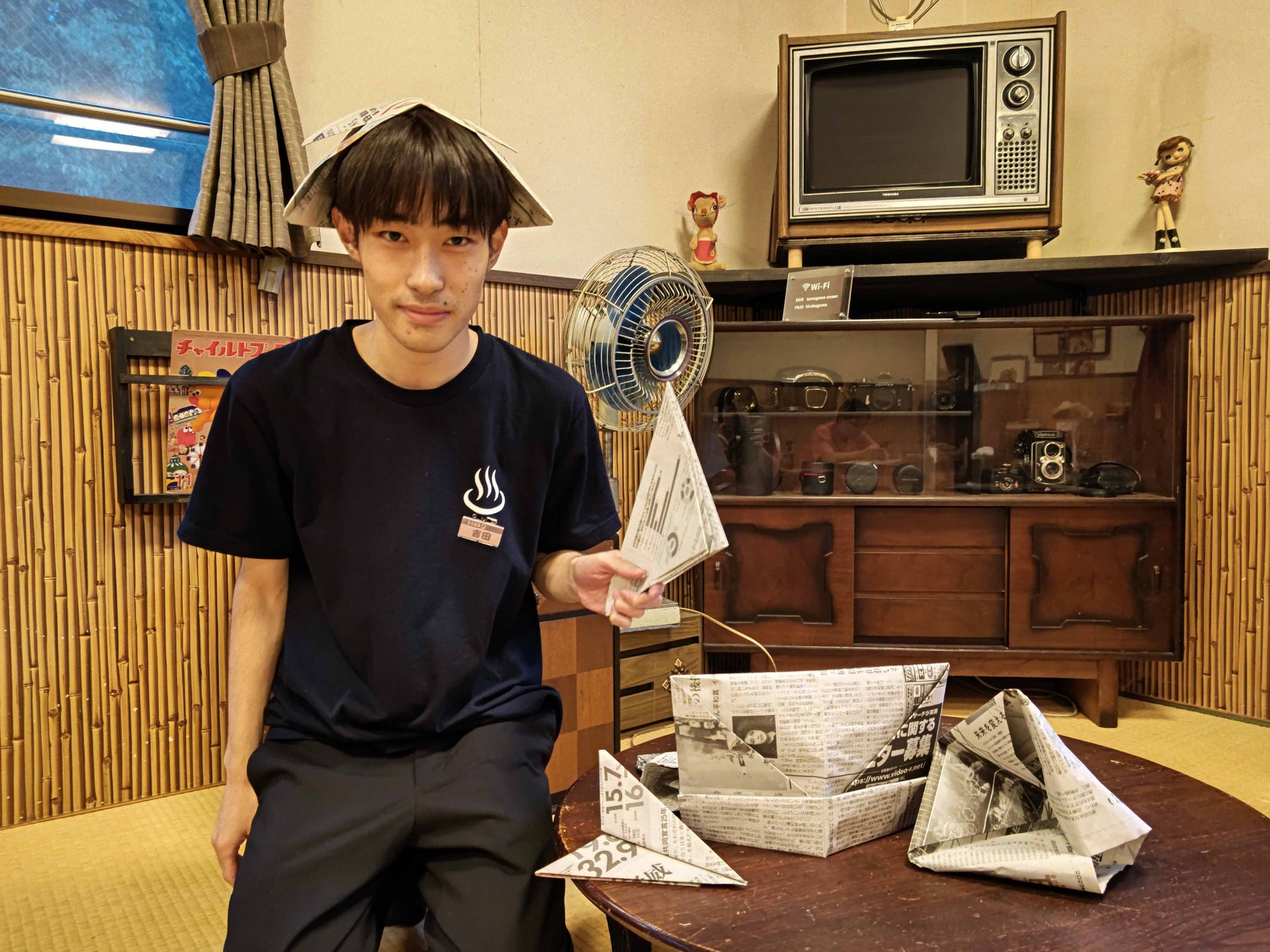 昭和レトロな温泉銭湯玉川温泉で、新聞週間に合わせインターン生考案「新聞紙で作る昔あそび」イベントを開催