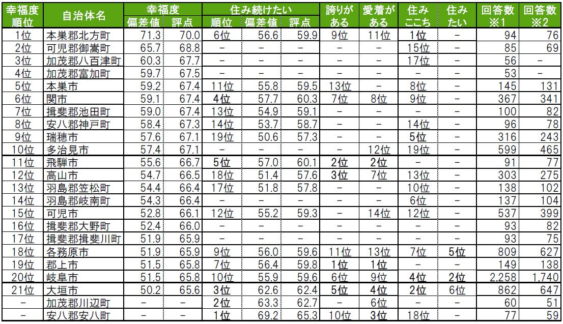 いい部屋ネット「街の幸福度 & 住み続けたい街ランキング2022<岐阜県版>」(街の住みここちランキング特別集計)発表