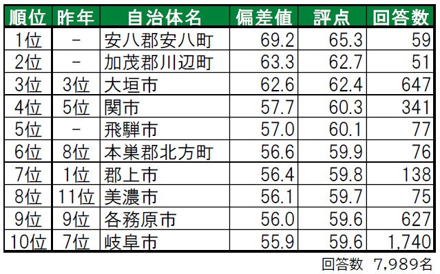 1位の安八郡安八町は、昨年はランキング外だった町で、「街に愛着がある」でも3位となっています。2位は加茂郡川辺町で、昨年は累計回答数が50名未満だったためランキング集計対象外でした。3位は、2年連続で大垣市で、 「住みここち」では2位の高評価を得ている街です。