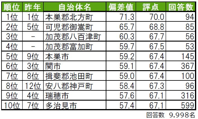 1位は2年連続で本巣郡北方町で、唯一偏差値70台の高い評価です。本巣郡北方町は、「住みここち」でも1位となっています。2位は可児郡御嵩町で、昨年5位から順位を上げています。3位は加茂郡八百津町で、昨年は累計回答数が50名未満だったためランキング集計対象外だった町です。4位も3位と同じ加茂郡に属する富加町がランクインしており、トップ4は全て郡部の「町」となっています。