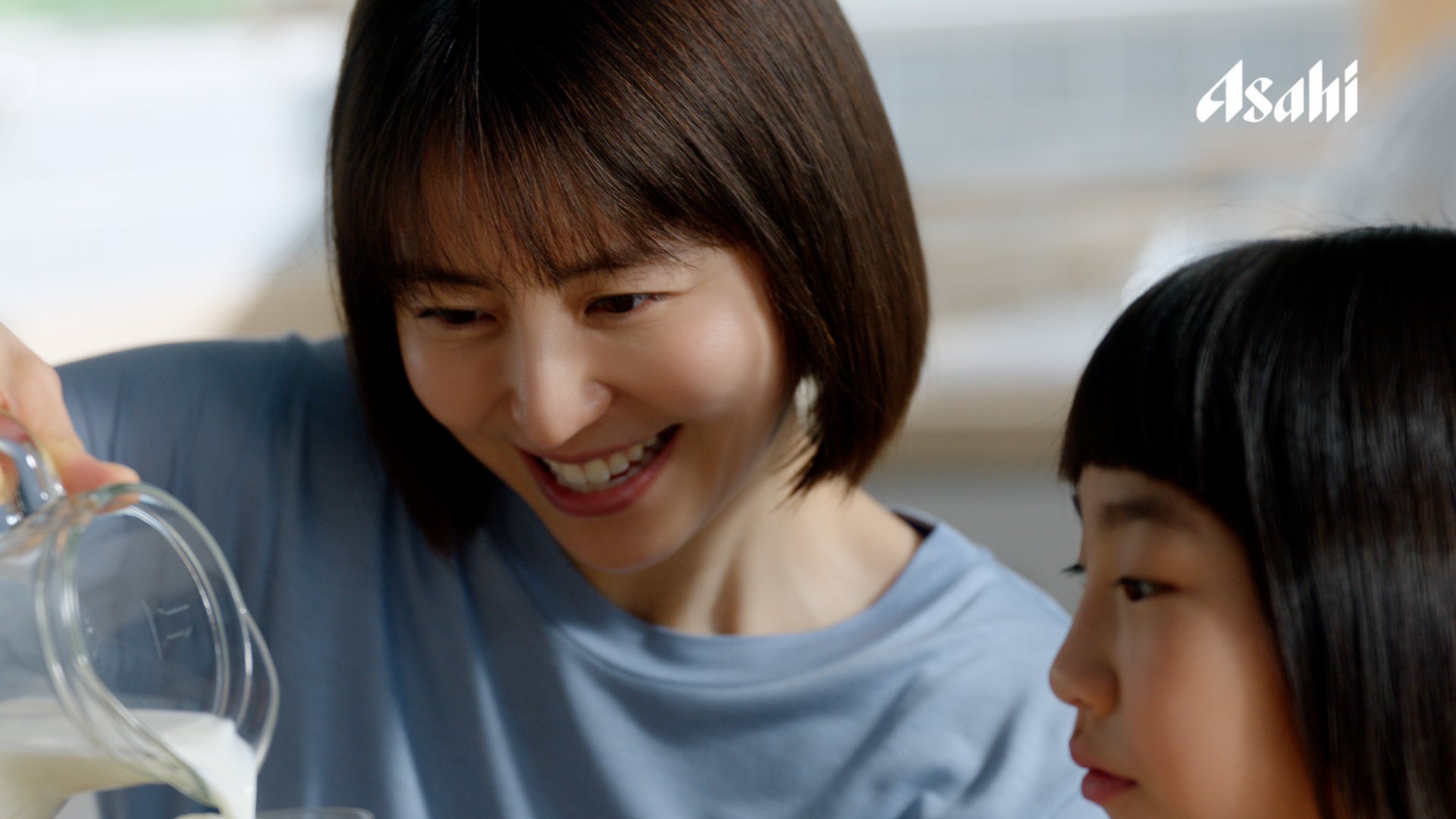 「カルピスを飲んだ顔」編は、休日の昼下がりに、母親役の長澤さんと娘がダイニングで「カルピス」の牛乳割りを作るシーンから始まります。マドラーで「ぐるぐる~」と楽しそうにかき混ぜます。できあがった「カルピス」をリビングで待つ家族のもとに運び、爽やかな風に吹かれながら「カルピス」を飲むと、思わず笑顔がこぼれます。「今日も『いい顔』いただきましたぁ!」という長澤さんのせりふが印象的です。