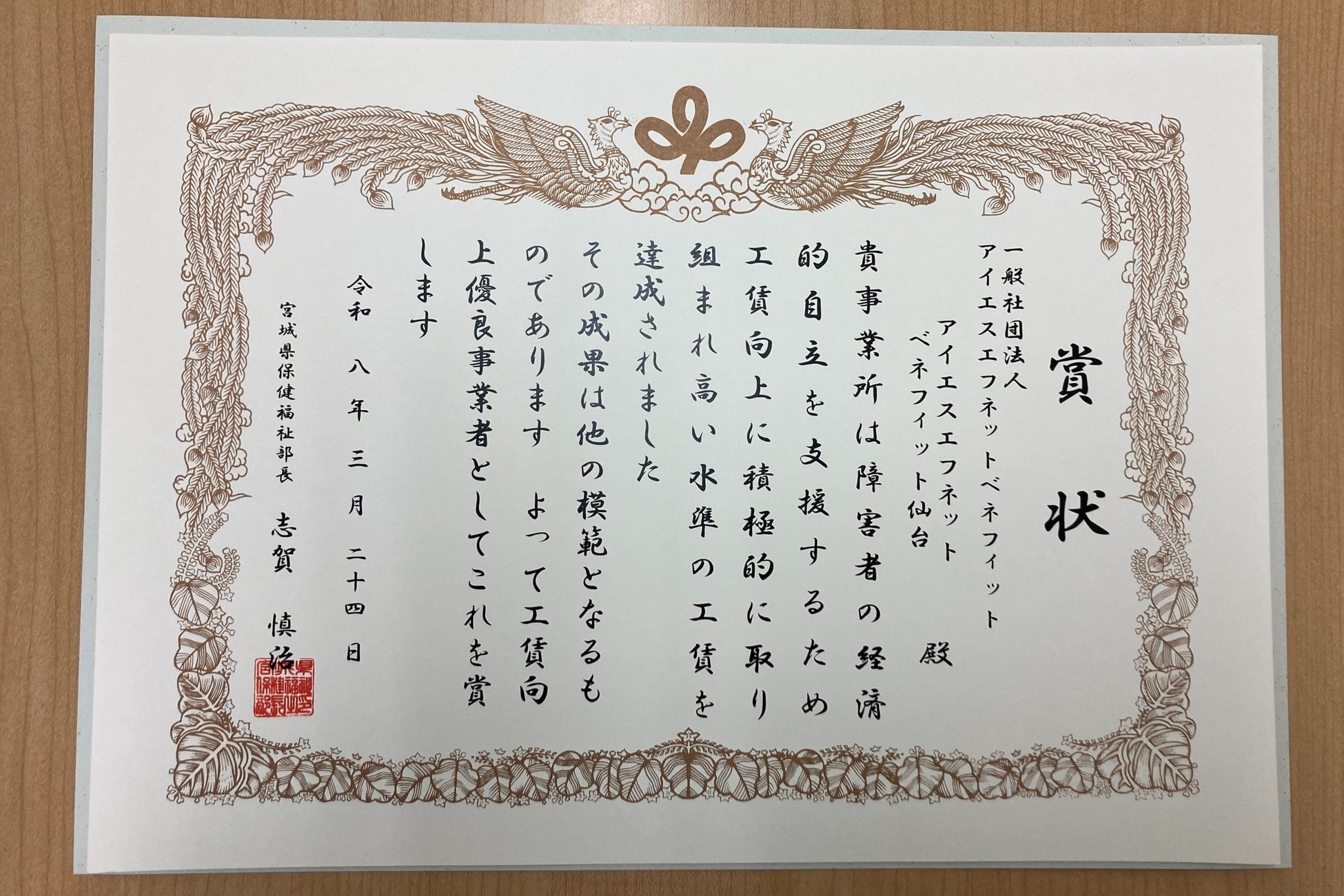 一般社団法人アイエスエフネットベネフィット(拠点:東京都港区、代表理事:渡邉幸義、以下アイエスエフネットベネフィット)の仙台事業所は、2026年3月24日(火)、宮城県より令和7年度「工賃向上優良事業者表彰」を授与されました。本表彰は、宮城県が推進する「第五期宮城県工賃向上支援計画」において、特に優れた工賃向上実績を上げた事業所に贈られるものです。