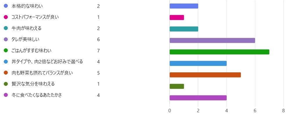 最も多くの票を集めたのは『ごはんがすすむ味わい』というポイントでした。以下2位は『タレが美味しい』、『肉も野菜も摂れてバランスが良い』でした。