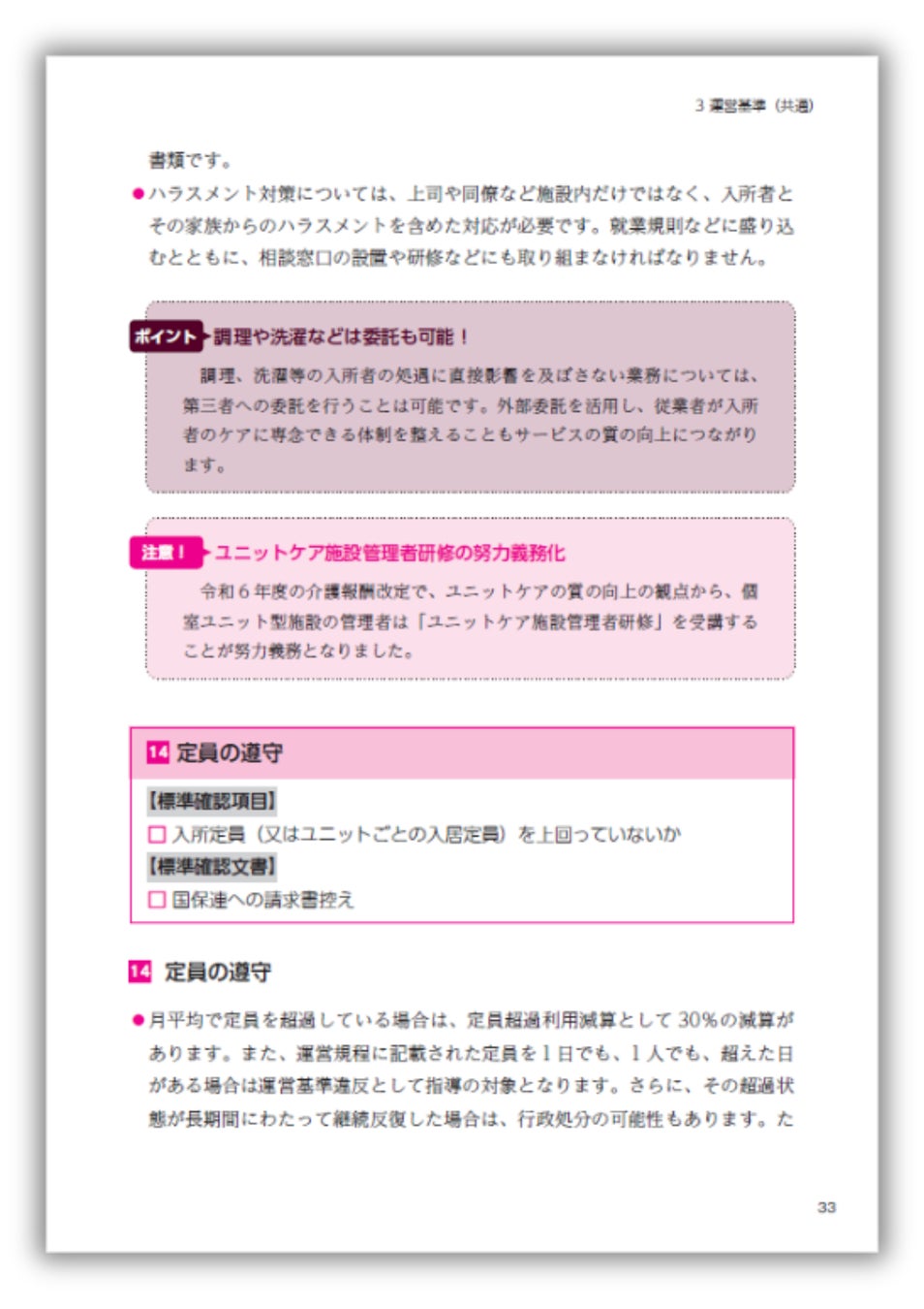 各項目ごとにおさえておきたい「ポイント」や、ついやってしまいがちだけど本来気をつけなければいけない「注意点」を介護経営コンサルタントの視点から詳説!
