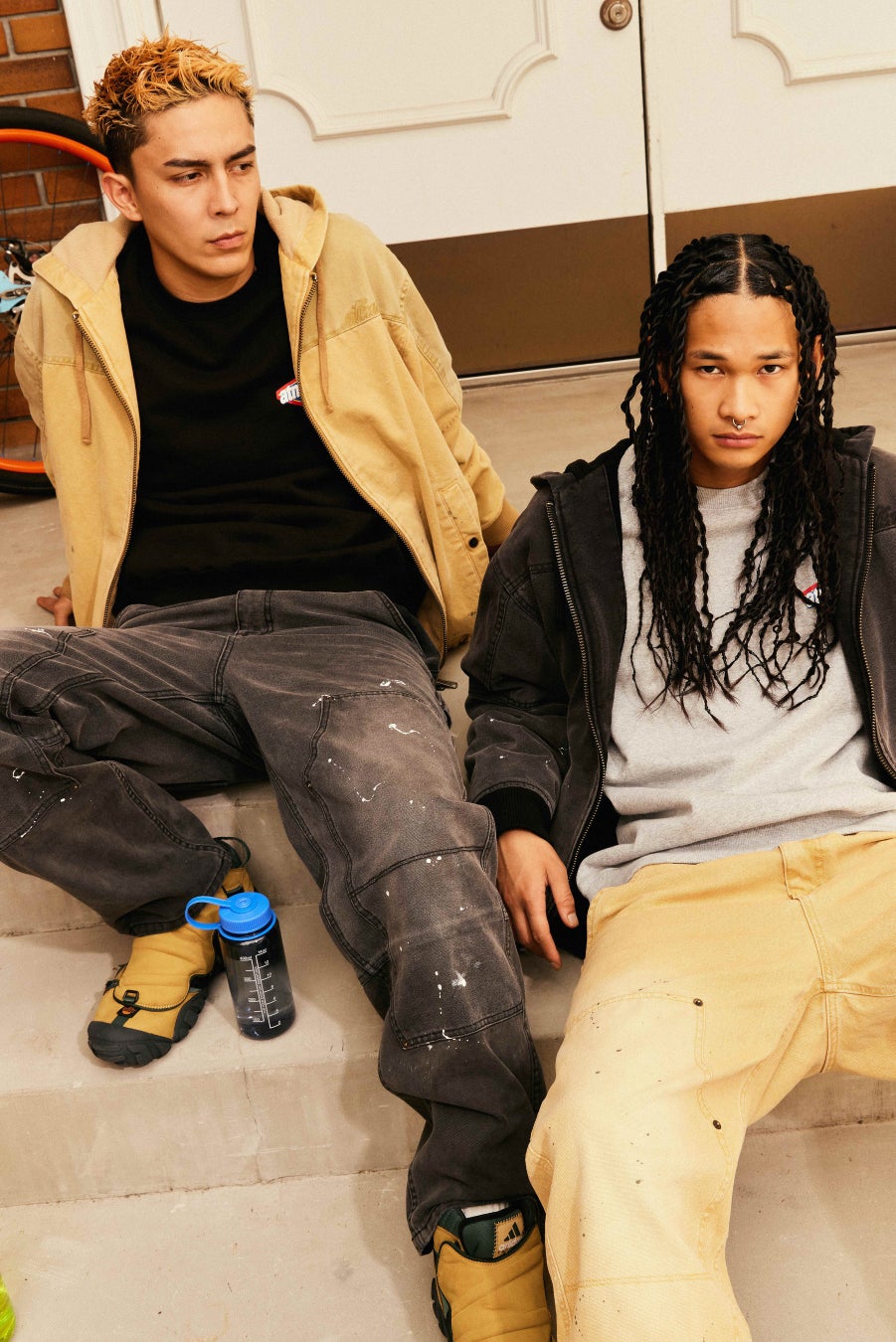 フリース素材とナイロンを組み合わせたトップスや、ワークウェアに使用されるダック生地をブリーチ加工したワークジャケットとダブルニーパンツに加え、ニットキャップやポンポン付きの遊び心あるビーニーなど、秋冬のコーディネートを彩るアイテムを揃えています。