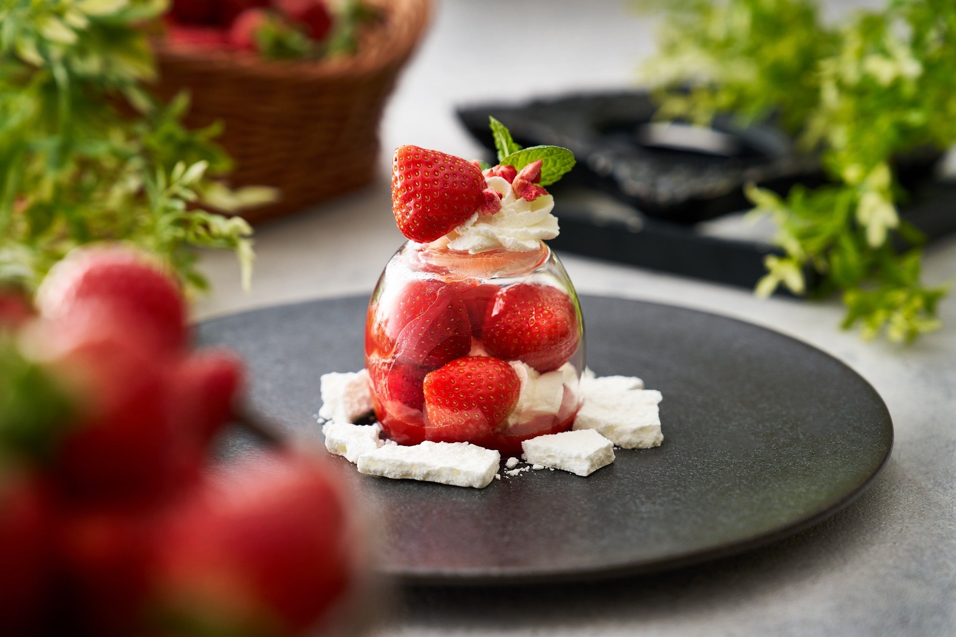 一推しはシェフの一皿「こぼれ苺~雫の里~」。グラスの中に詰まった苺は、京都亀岡 雫の里農園にて栽培している女峰を使用。芳醇な香りが特徴で、酸味と甘みのバランスの良い女峰をグラスの中にとじ込めました。グラスを持ち上げると、中から女峰と、苺で作ったソースがこぼれ、苺の甘酸っぱい香りが広がります。サクサクのメレンゲとともに味わっていただける一皿を、小学生以上のお客様一人一皿ずつ、お席までお持ちします。