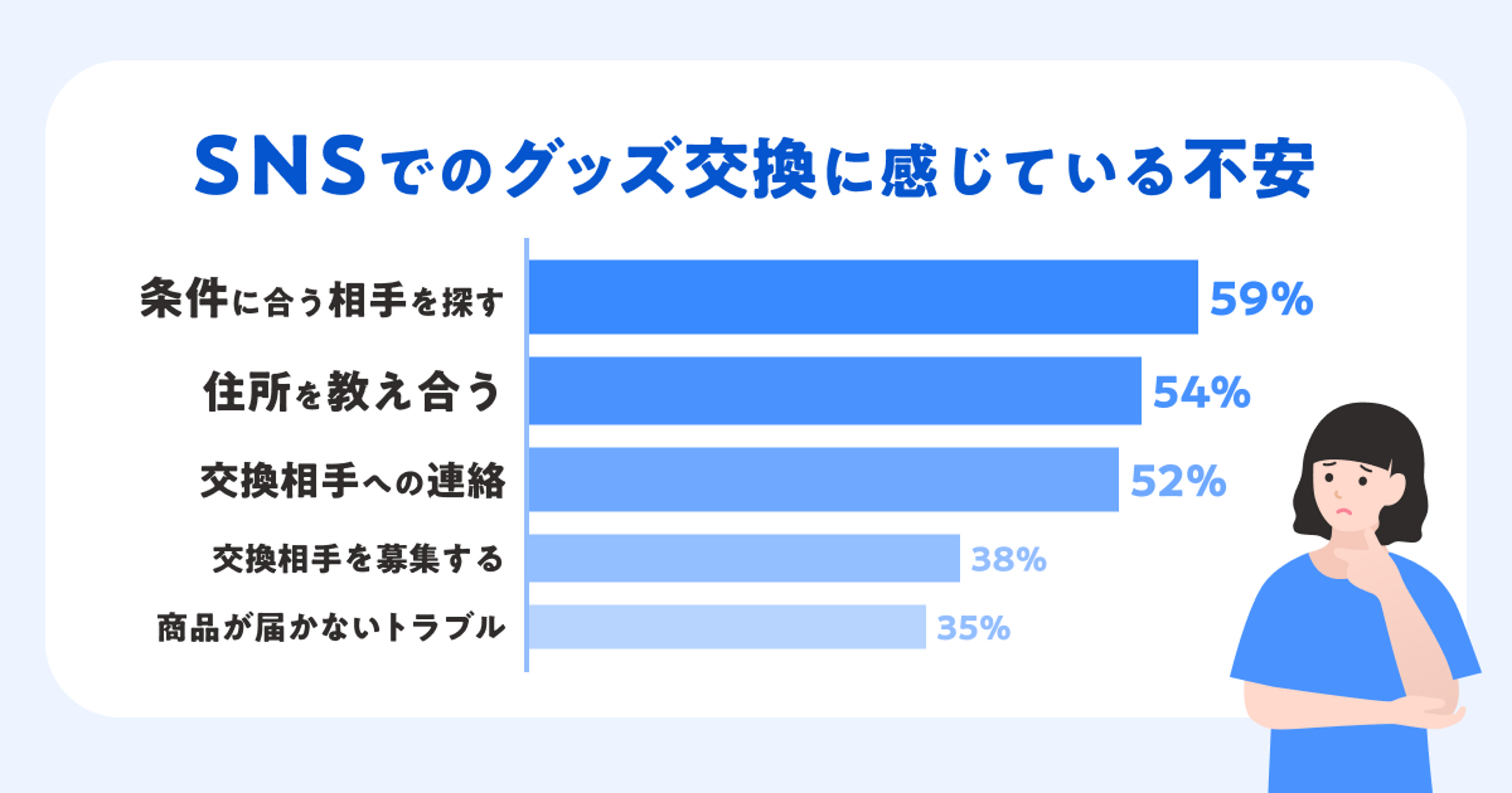 一方で、SNSでのグッズ交換に不安や課題を感じる声もあり、「条件に合う相手を探す」「住所を教え合う」「交換相手への連絡」といった点は、グッズ交換を行ったことがある方の中でも半数以上が気になるポイントとして挙げています。さまざまな情報が飛び交うSNSでは、条件に合う相手を見つけることが難しいと感じている人が多いほか、知らない人と個人情報のやりとりを行うのは抵抗がある人が多いとうかがえます。