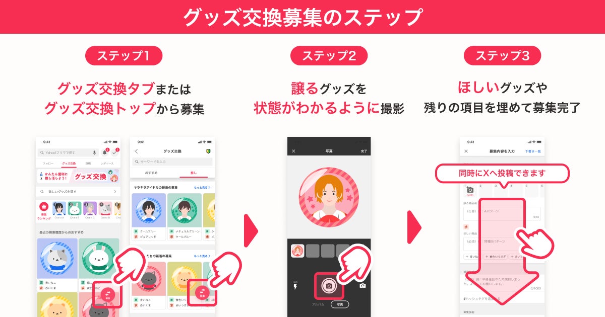 「Yahoo!フリマ」が提供するグッズ交換機能は、お互い匿名ですべてのやりとりを完結できるのが特徴です。また、推しのキャラクターや人名をあらかじめ登録しておくと簡単に関連グッズを探すことができ、条件に合った相手を見つけやすくなります。出品時には交換したいグッズの写真を撮って専用フォームに入力するだけで、簡単に交換の募集ができます。