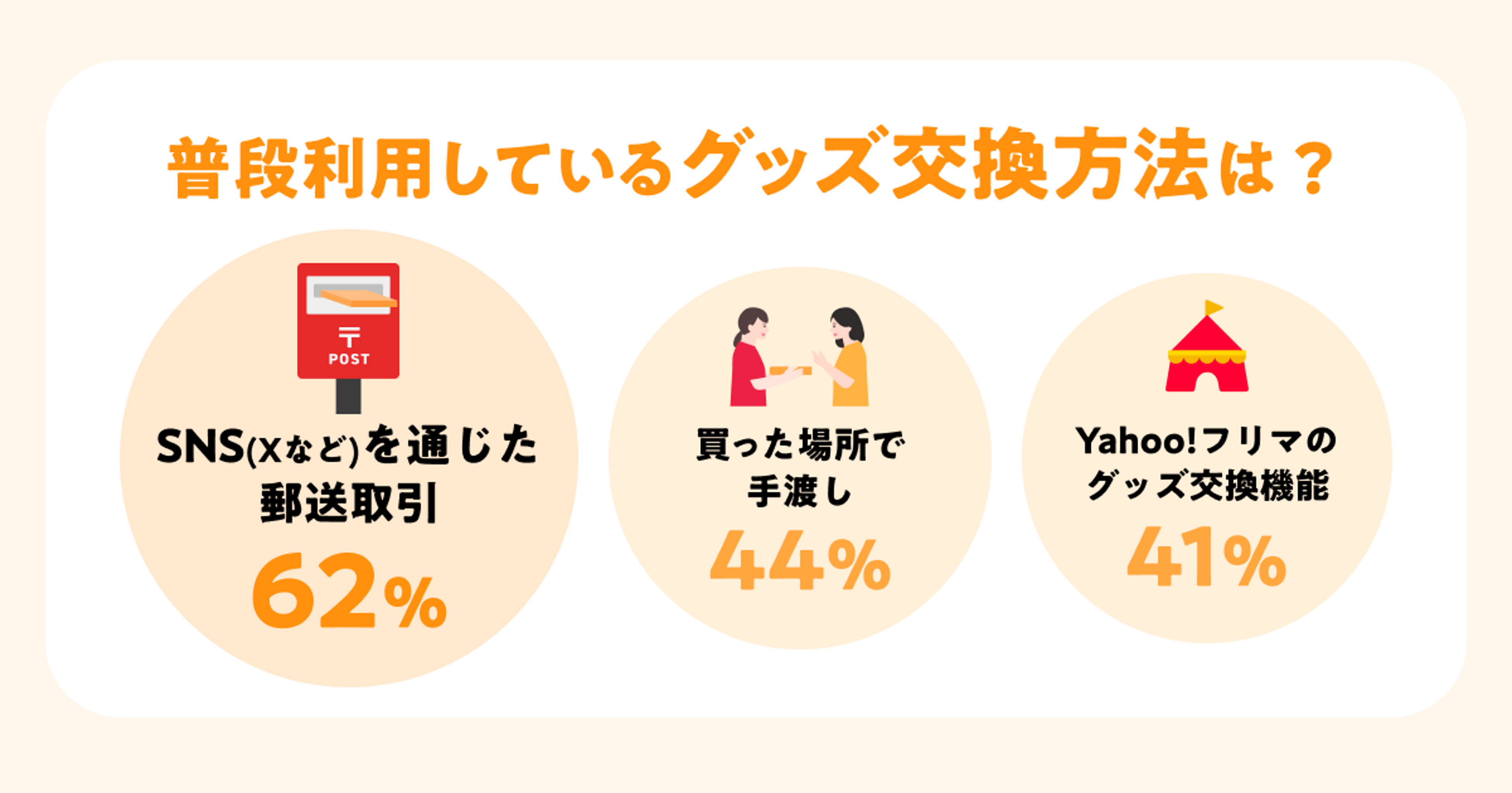 グッズ交換をしたことがあると回答したユーザーを対象に行った、グッズ交換の方法に関する設問では「SNSなどを通じた郵送取引」が1位という結果でした。次いで「買った場所で手渡し」「Yahoo!フリマのグッズ交換機能」となっています。