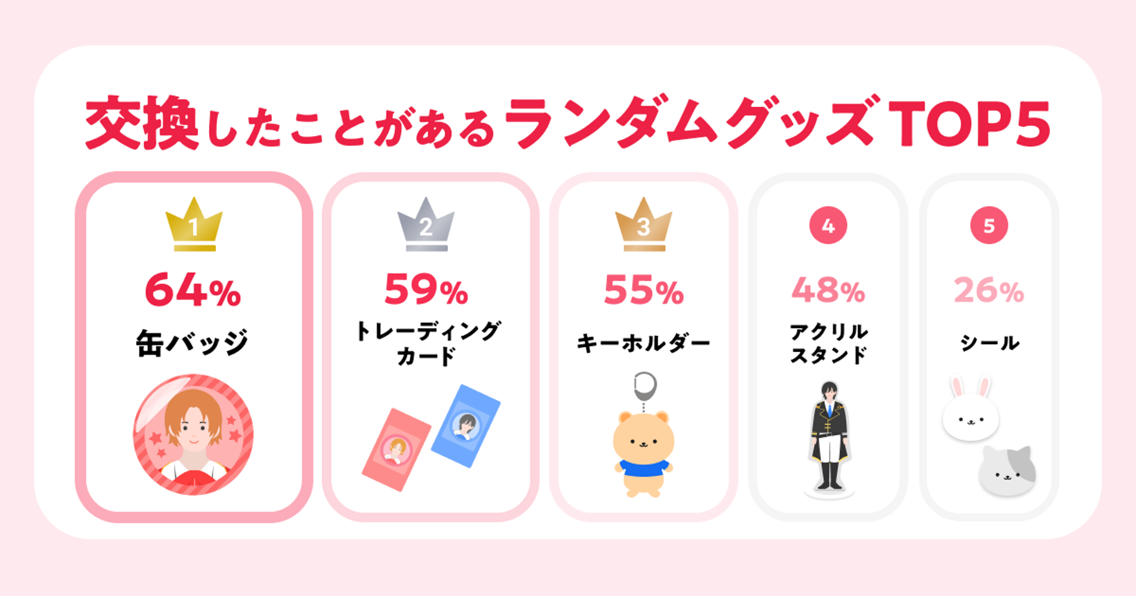 アンケートによると、推し活でグッズ購入をする人の33%はグッズの交換をしたことがあるとわかりました。缶バッジやトレーディングカード、キーホルダーなどが主に交換しているグッズとして挙がっており、ランダム性が高く、幅広いジャンルで扱われているアイテムであるからと推測されます。