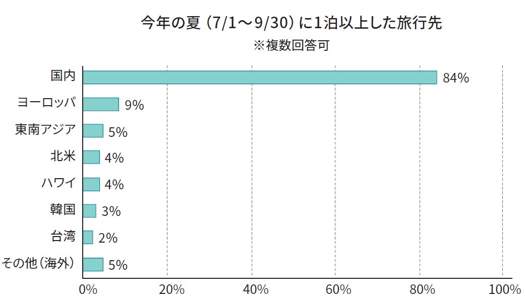 今年の夏に、国内を旅行先に選んだかたは84%でした。世界的な物価高と円安を背景に、国内を行き先に選んだかたが多いことがうかがえます。